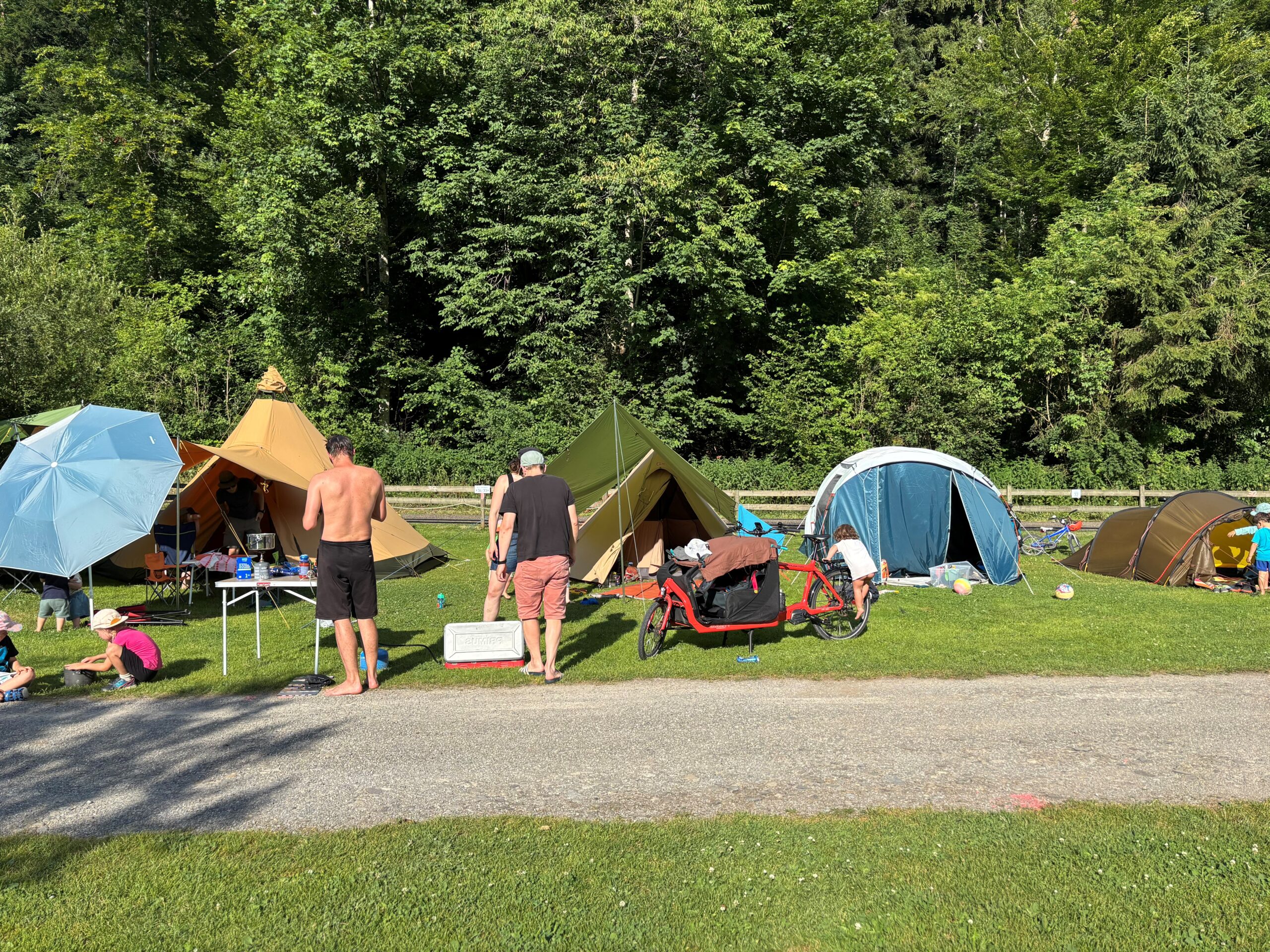 Campingausrüstung inkl. Kochmaterial, Zelt oder Büssli, Badehosen und Tüechli, Sändelisachen und Spielbälle, und alles was noch so für ein Campingweekend notwendig ist.