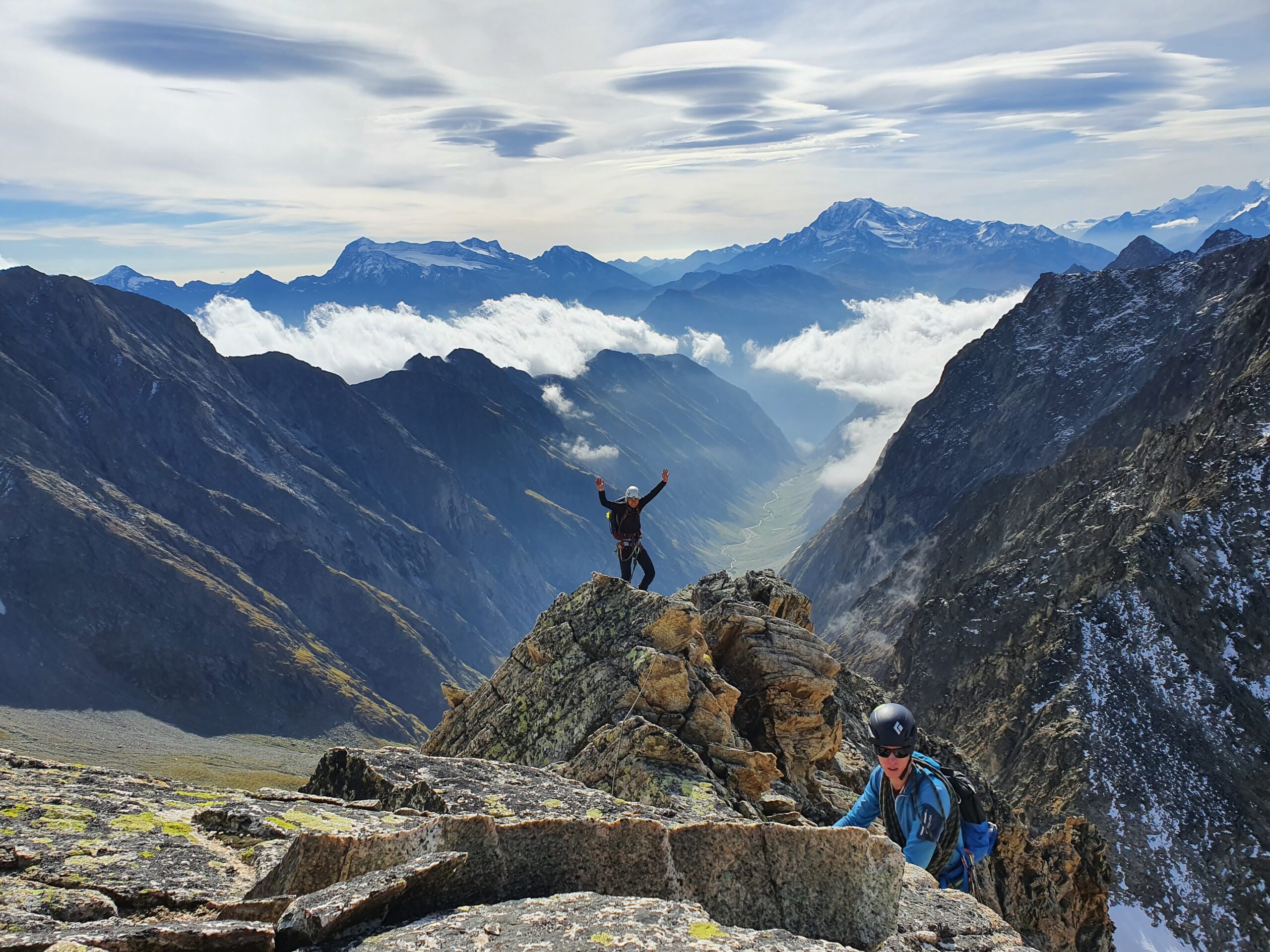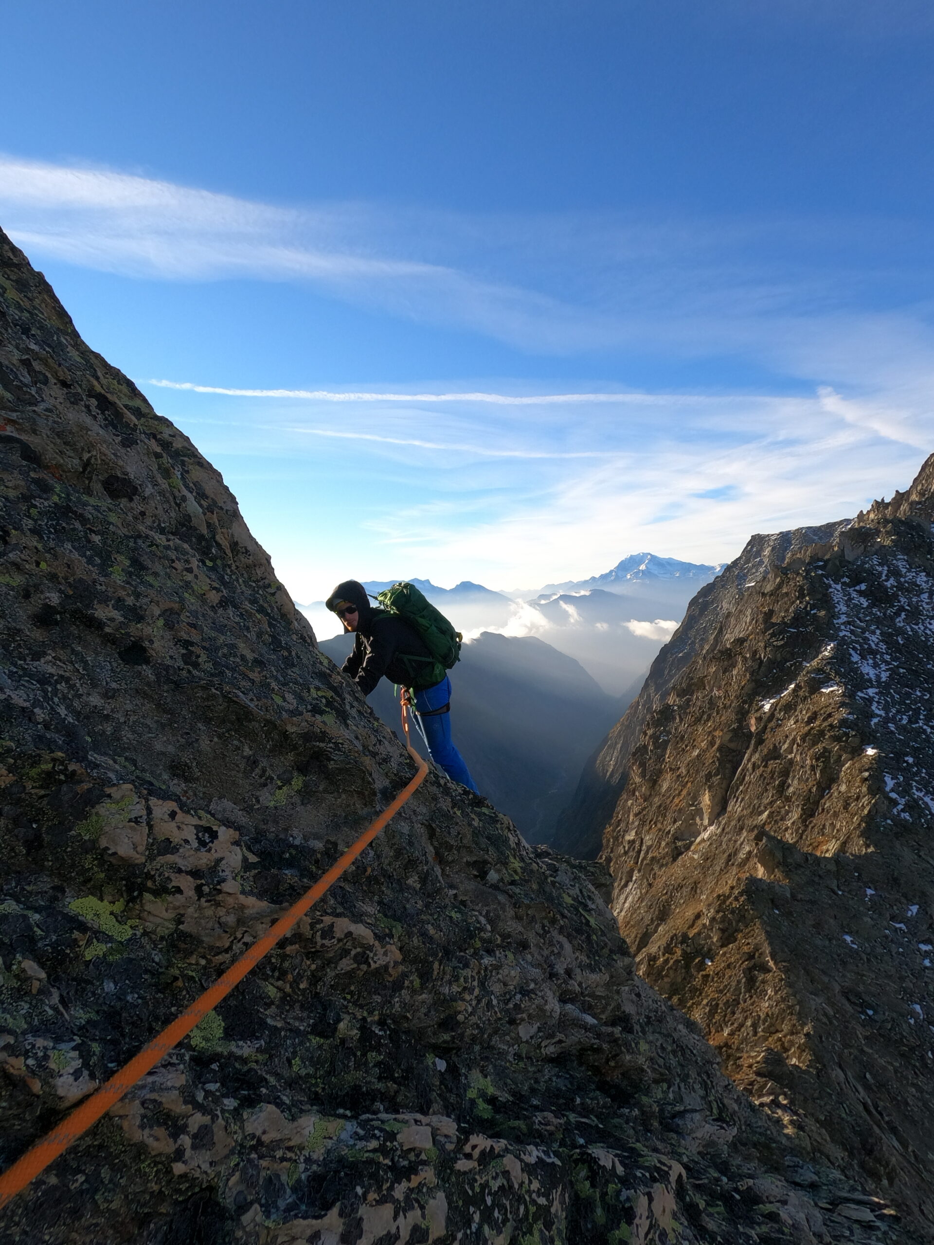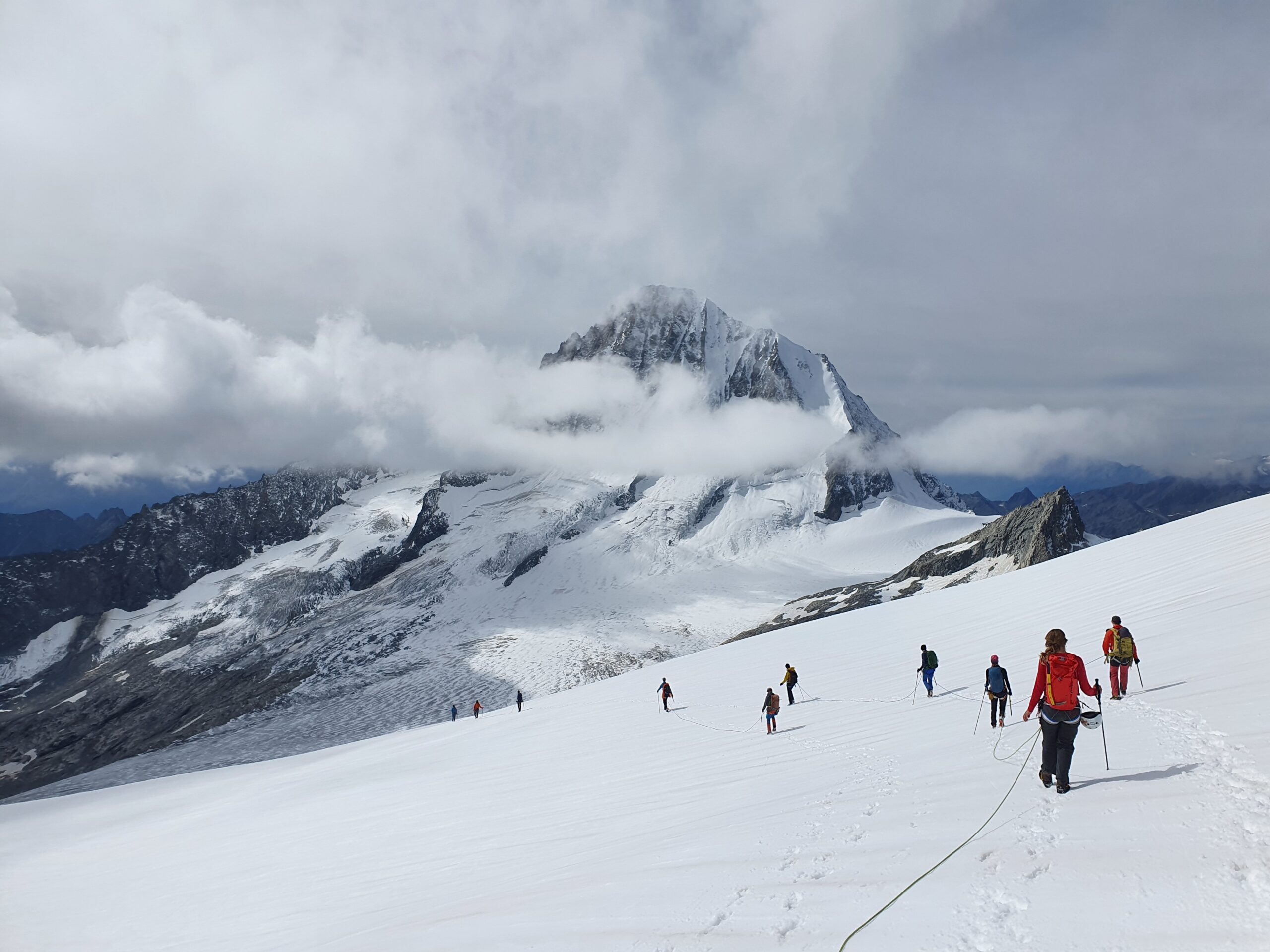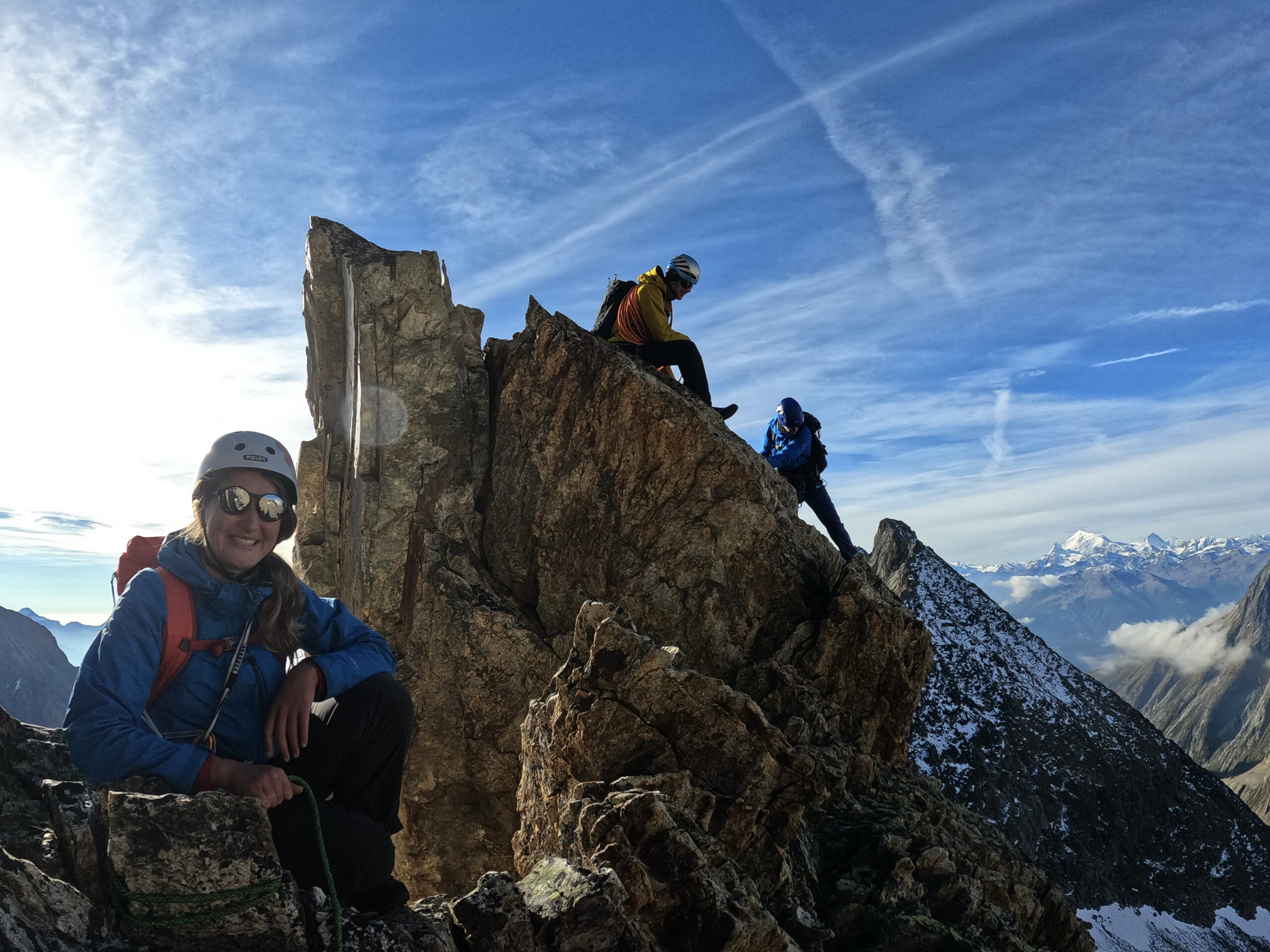 Bir Tour ufz Breitlauihorn am nächste Tag hetme de scho im Vorus chli gwüsst, ws mit «Kraksle» gmeint isch – mir si nachdr Gletscherüberquerig (wo schön, aber gar nid so spannend wi erwartet isch gsi) no feiechli klätteret (odr äbe krakslet) und hei dobe aacho ziemlech lang chönne di superschöni Ussicht gniesse. Am Morge denn heimr zwar nid mit veriisete Steine z Kämpfe gha, drfür mit glattgschlieffene Platte, wo teu wines Gemschi si ufegloffe und teu äbe weniger…