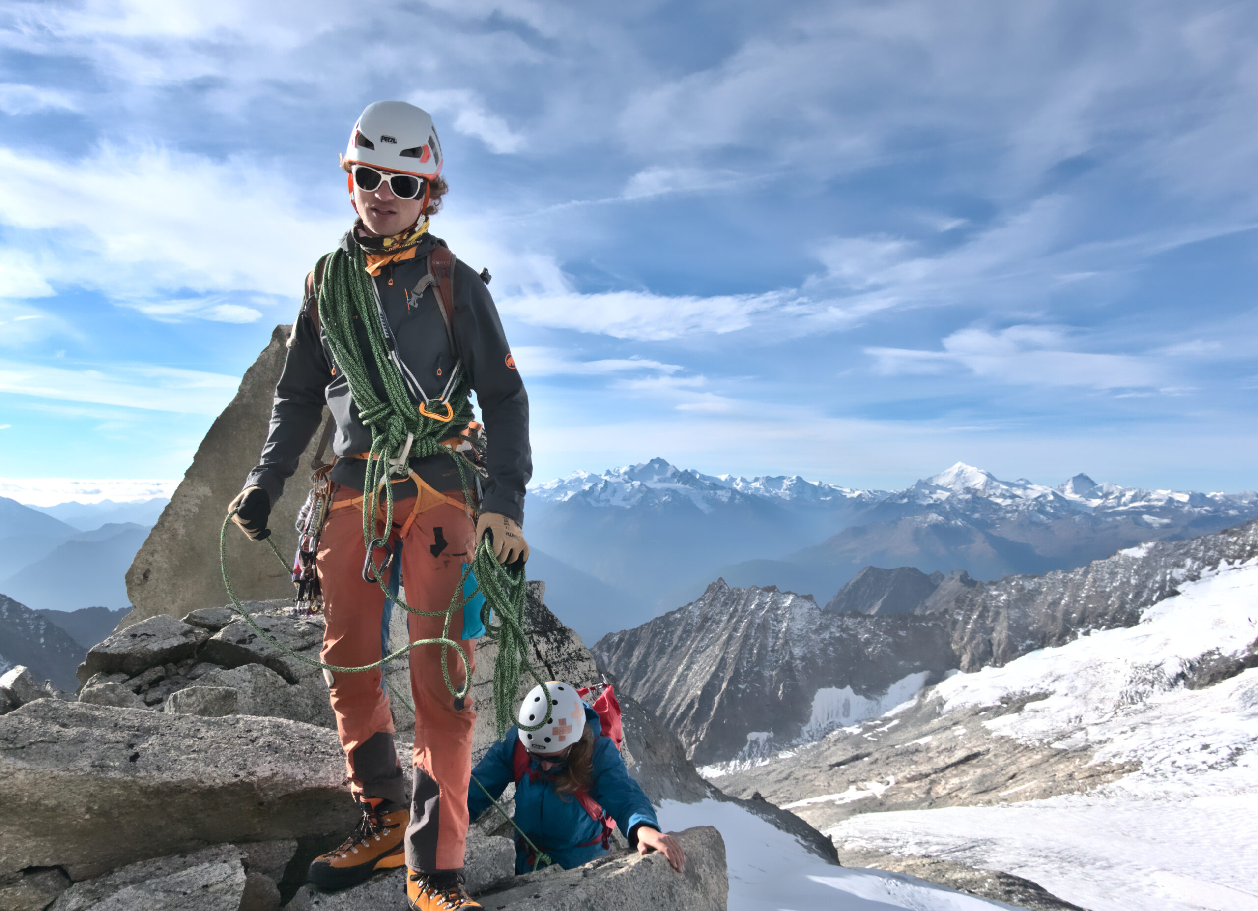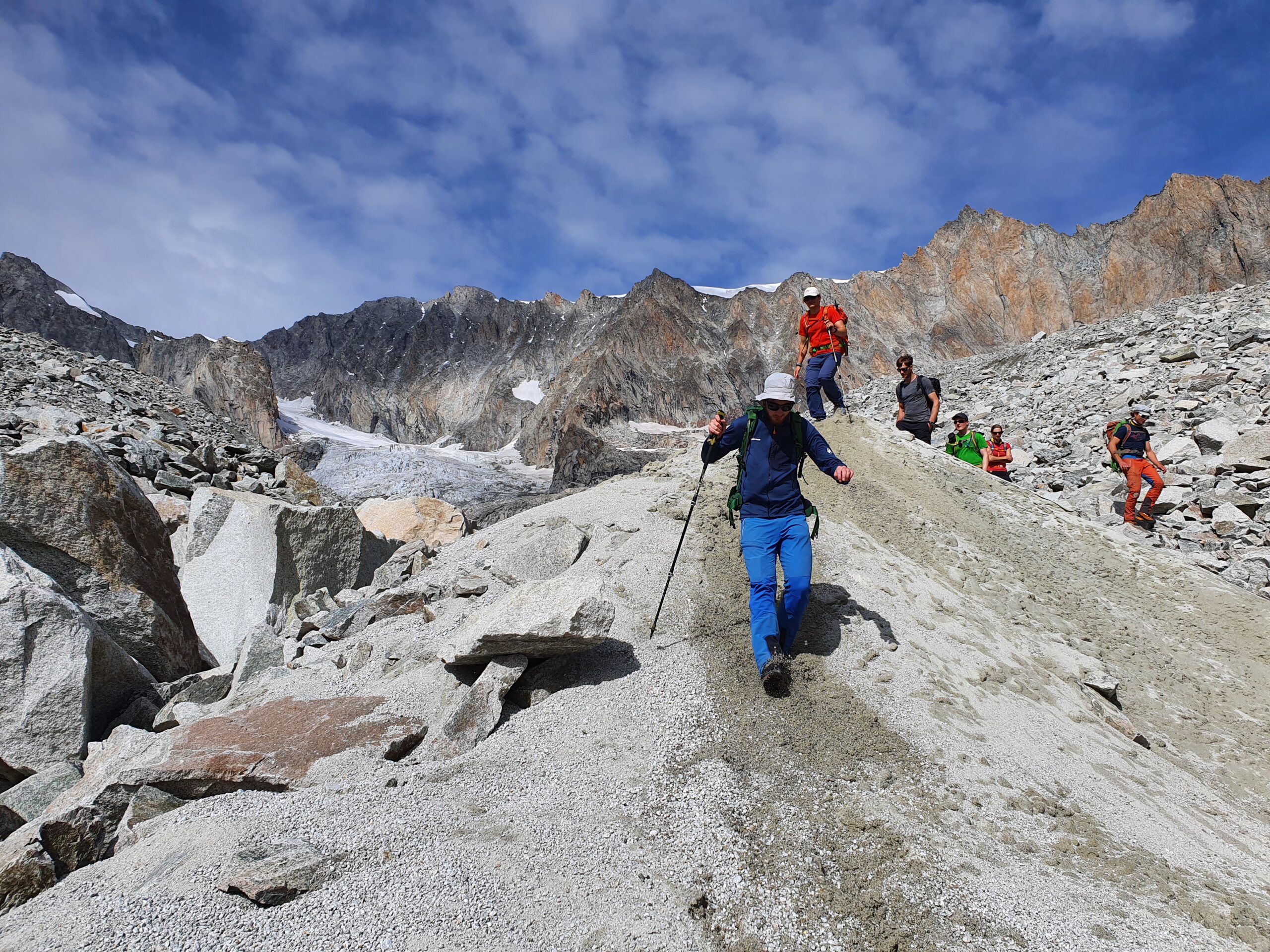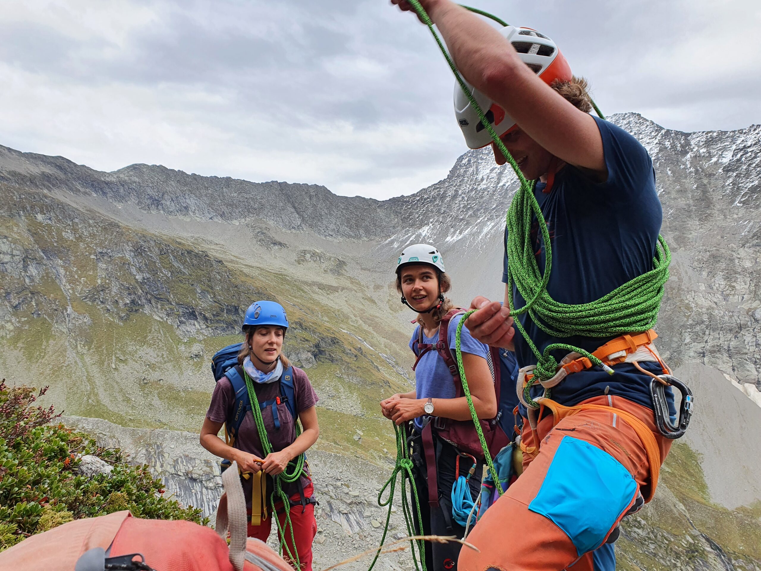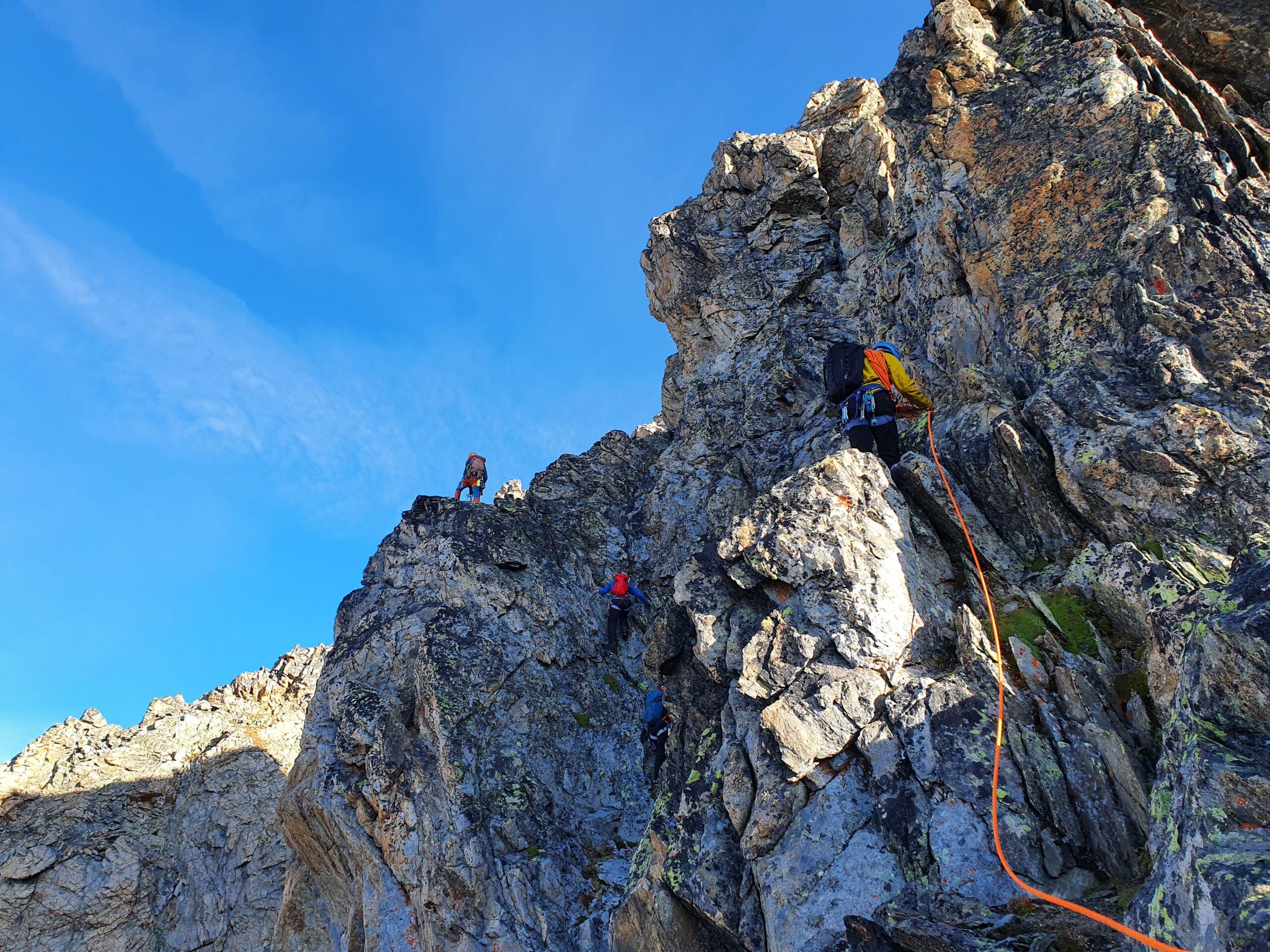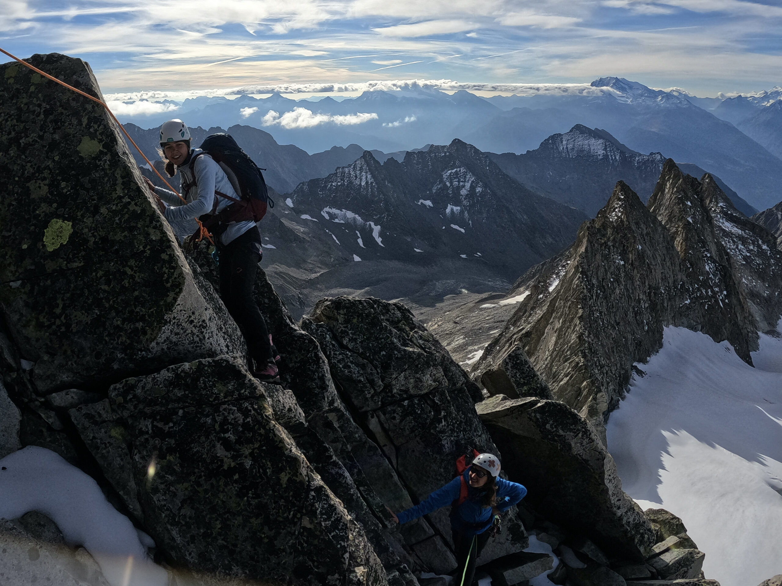 Bir Tour ufz Breitlauihorn am nächste Tag hetme de scho im Vorus chli gwüsst, ws mit «Kraksle» gmeint isch – mir si nachdr Gletscherüberquerig (wo schön, aber gar nid so spannend wi erwartet isch gsi) no feiechli klätteret (odr äbe krakslet) und hei dobe aacho ziemlech lang chönne di superschöni Ussicht gniesse. Am Morge denn heimr zwar nid mit veriisete Steine z Kämpfe gha, drfür mit glattgschlieffene Platte, wo teu wines Gemschi si ufegloffe und teu äbe weniger…