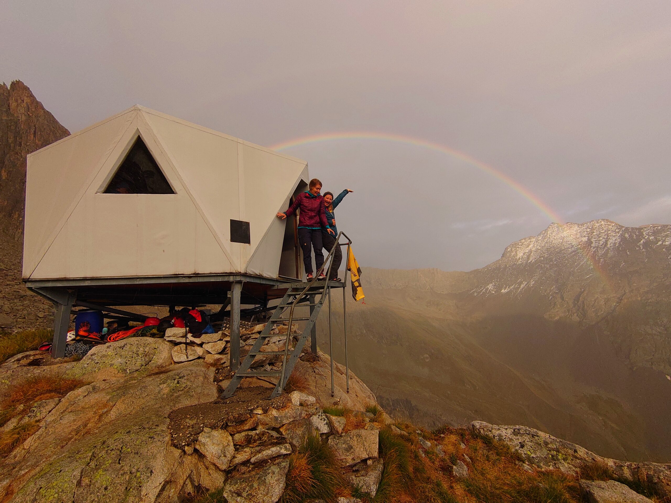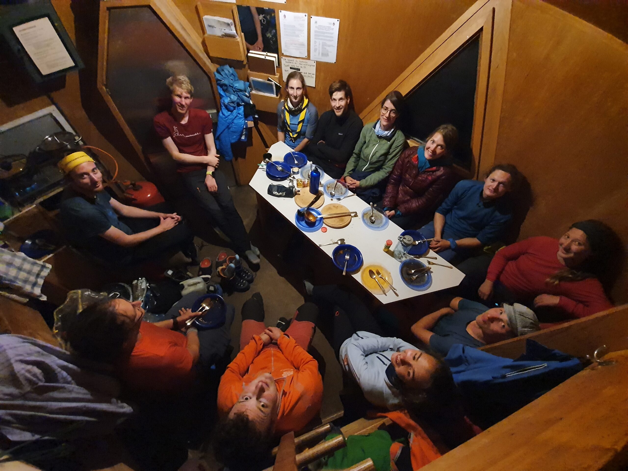 Am erste Tag heimr de grd e «Iistigstour» ufe erst Turm vom Stockhorn gmacht. So easy isch de di Iistigstour am Schluss doch nid gsi, wöu z Wätter hetnis bim Abstieg nidso nätt behandlet – villech wägdr Helen, wöu si am Aafang vom Lager het gseit, dssi no mau e Schneesturm wett…? Jedefaus simr guet und troche aacho, aber bim Abstig hets nis dermaase verchutet und verschiffet, dsmr de gottefroh si gsi, widr im Stockhornbiwak zsii. Abr nei, üse Tag isch denn no nid fertig gsi, mir si när no id Baldschiederklause gloffe. Ds het aber när dr Vorteil gha, dsmr dert de aui üsi Sache richtig schön hei chönne usbreite (respektive dr ganz Rucksack uf einisch hei chönne uslääre, wis dr Nino aube pflegt zmache) und vor Jolanda es feins Znacht hei becho – sogar mit gnue Stüu für aui zum Hocke!