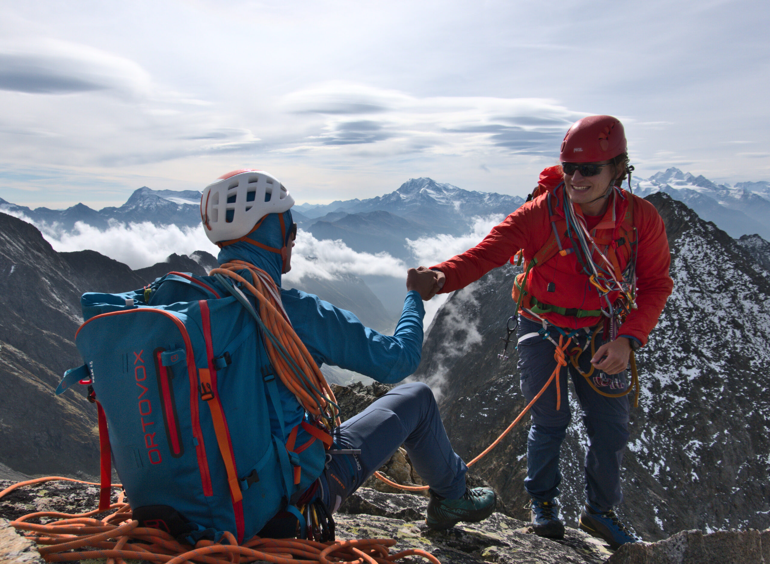 Am nächste Morge isches de am 6i los gange i richtig Baldschiederhorn. So am früeche, chaute Morge isches (mi chas nid angers säge) huere glatt gsi uf dene Gröllfälder…ds het zu einige unschöne Stürz gfüert. Zum Glück si aber aui no glimpflech usgange. Dobe aacho het de scho widr eis vode Gstäutli gfäut, dasmau nid das vom Jonas sondern das vom Tornado – das mitdr Vorbildsfunktion het da somit grad scho widr chli ghapperet 😉. Zum Glück het aber dr Jonas de gwüsst, wime us Schlinge etc. es Gstäutli cha «bastle», und mir Angere si aui froh gsi, dsmr ds nid hei müesse anneha… Z aaschliessende «Kraksle» isch de für es paar Teilnähmendi scho meh id Definition Chlättere übergange – was aber sehr Spass het gmacht und am Schluss mitemne super Usblick ufem Gipfel und ere super Rösti vor Jolanda ir Hütte isch belohnt worde…😊