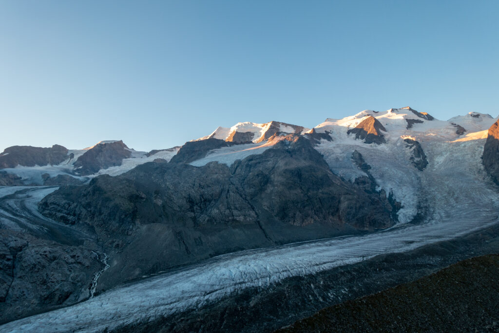 Nun komplett, starteten wir unseren zweiten Tag mit dem Thema Gletscherausbildung. Im Morgengrauen schritten wir über die Seitenmoränen auf den Morteratsch-Gletscher. Da es für gewisse Teilnehmerinnen das erste Mal war, dass sie Steigeisen an den Füssen trugen, hielten wir zuerst einmal verschiedene Hochzeiten ab, um das Laufen mit Steigeisen zu Trainieren (der Leser darf beruhigt sein, es war nur ein Spiel). Danach stiegen wir weiter über Geröll und Eis in Richtung des Punkt 3186 oberhalb der Vadret da la Fortezza auf. Nach dem wir verpflegt hatten, stiegen wir über den Gletscher wieder hinunter zur Hütte und lernten, bei einer Pause auch noch etwas über Flaschenzüge und Steileis-Klettern.