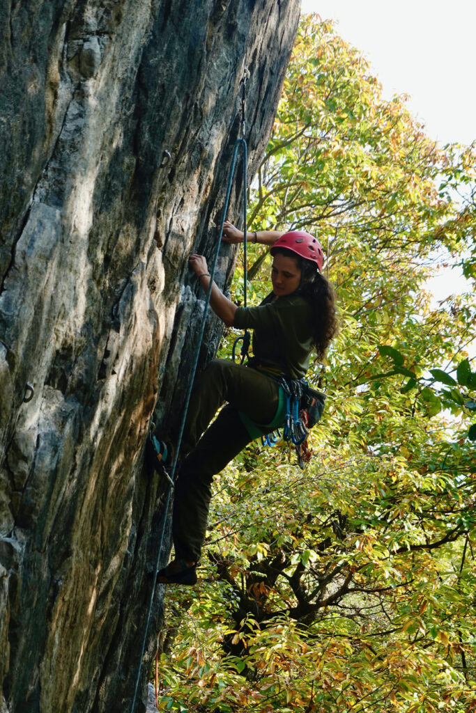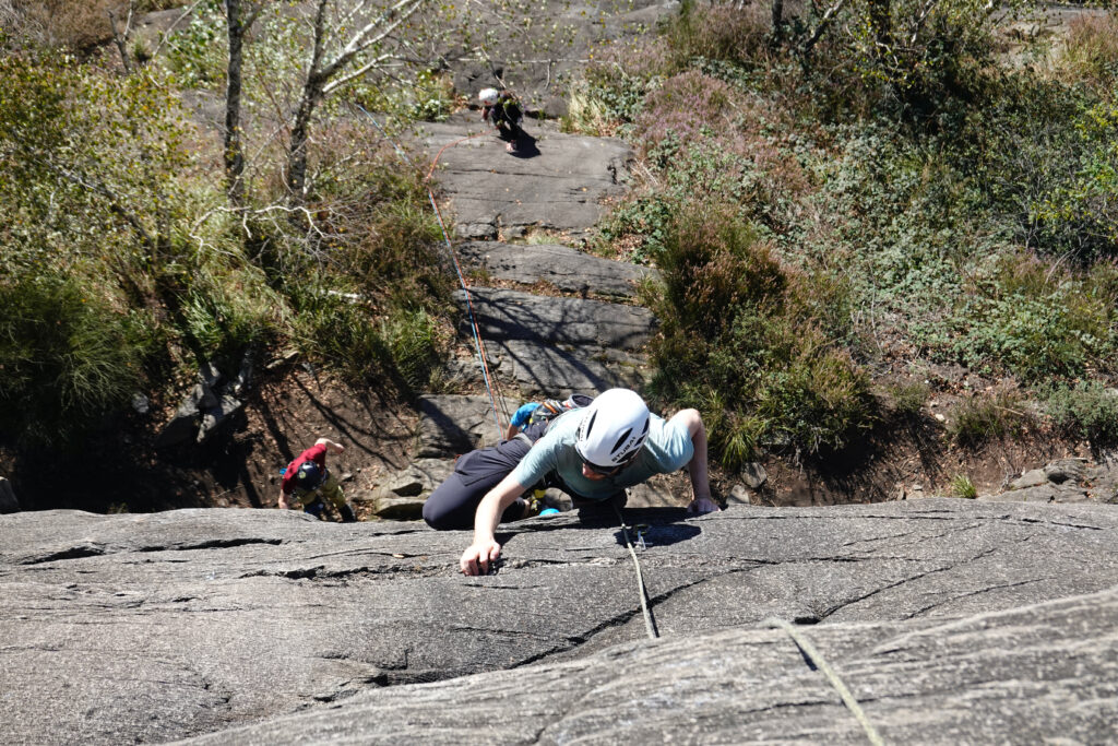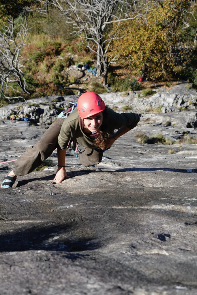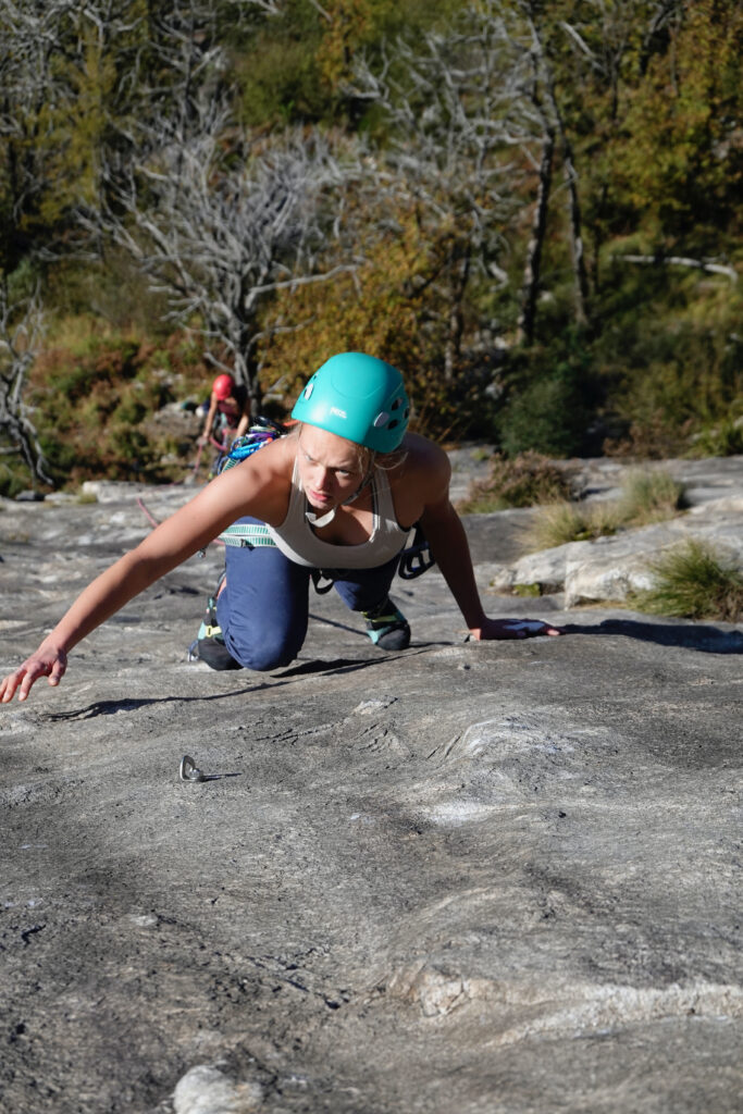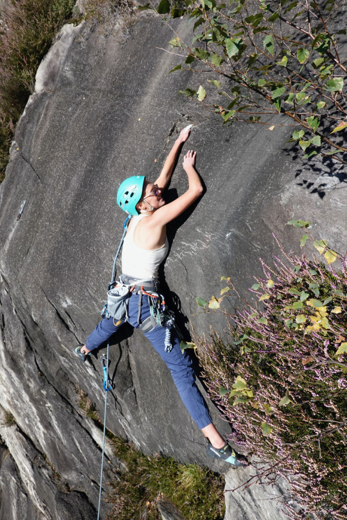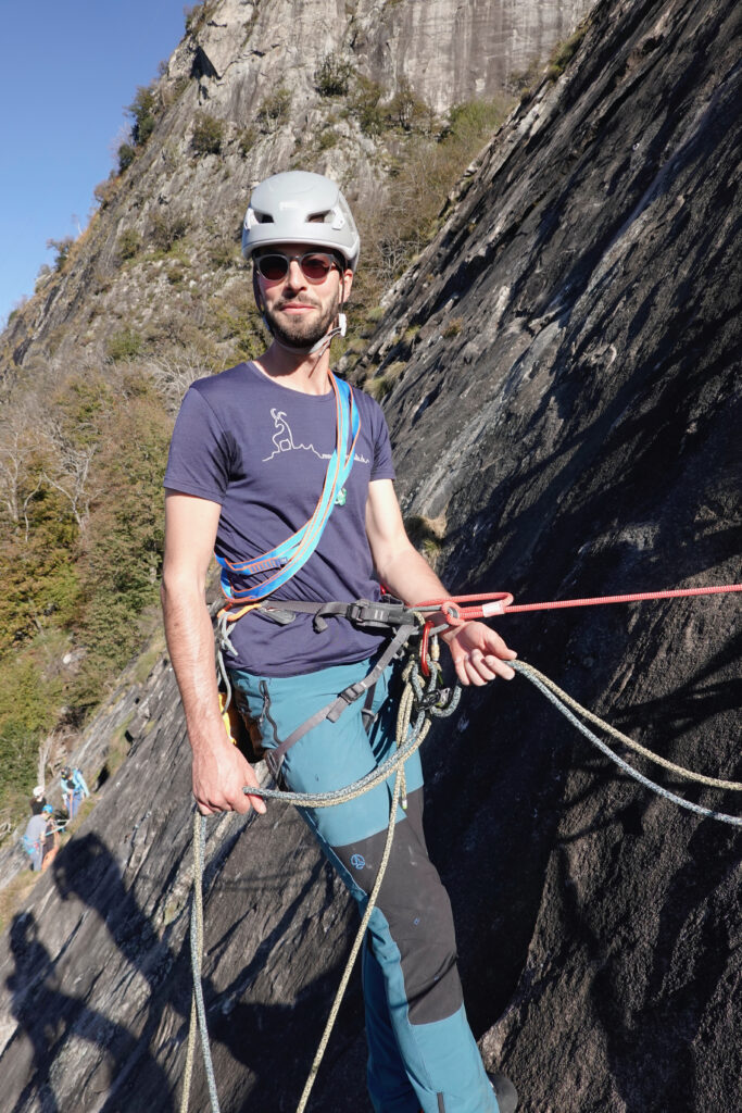 Am nächsten Tag schien dafür die Sonne und wir schwitzten doch ein wenig in der Südplatte von Ponte Brolla. Auf dem Programm standen das praktische Anwenden von Standplatzbauen in Mehrseillängen sowie das Abseilen. Wir übten das gleich in kleinen Gruppen, indem wir eine Route mit mehreren Seillängen kletterten. Der Nachmittag stand dann zur freien Verfügung, doch alle entschieden sich fürs klettern, entweder im Ost-oder Südsektor. Die Gruppe teilte sich auf und ein Grossteil genoss nach der Kletterei noch ein erfrischendes Bad in der eher kühlen Maggia. Am Abend wurden wir mit selbstgemachter Marronisuppe verwöhnt.