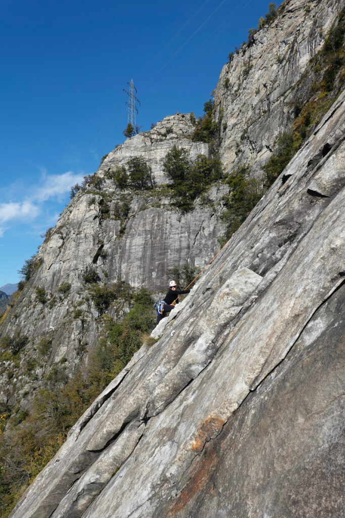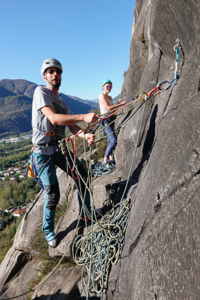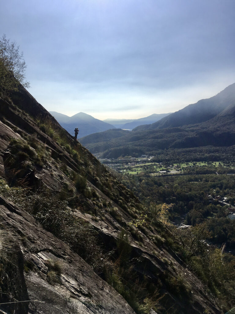 Das Wetter war nach Durchquerung des Gotthardtunnels nicht ganz so prickelnd wie erwartet. Das Tessin zeigte sich nebelverhangen und die Landschaft sah verdächtig nass aus. So machten wir am Nachmittag auch gleich einmal die Erfahrung, dass es sich auf nassem Fels nicht so gut klettern lässt. Plötzlich war eine 4a gar nicht mehr so einfach…
