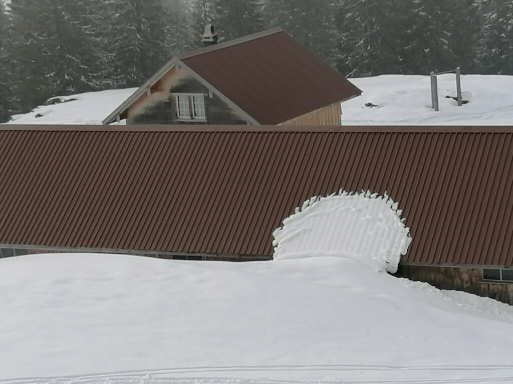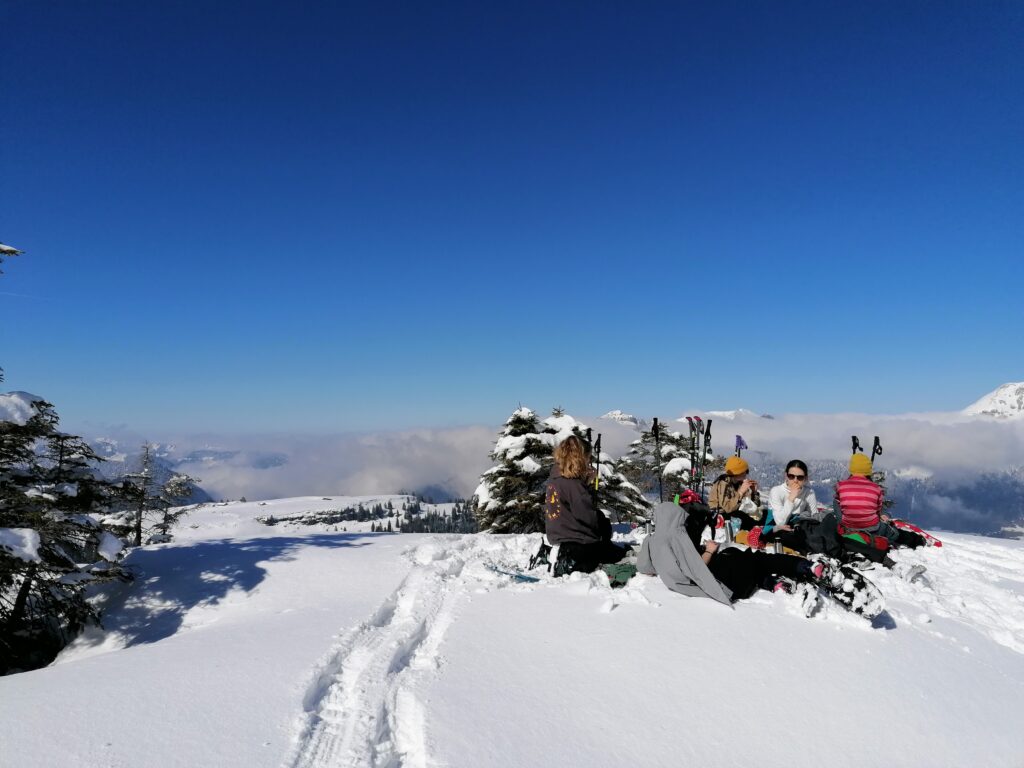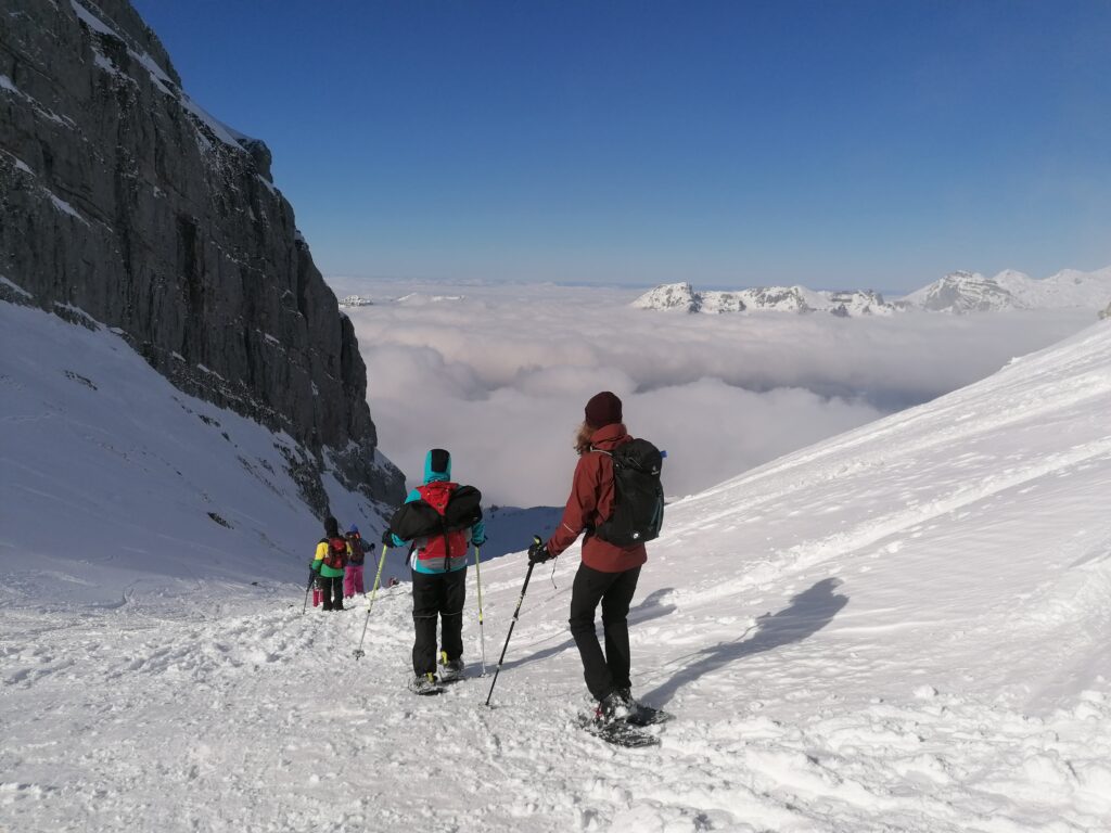 Kaum 20 Meter gelaufen, wartet der Schneeschuhpfad bereits mit einem steilen Abstieg auf, der mit den ungewohnten Geräten am Fuss nicht ganz einfach zu bewältigen war. Wir meistern diese Passage laufend, rutschend oder purzelnd, auf jeden Fall aber unversehrt. Nun geht’s «bergwärts» durch weisse Tannenwälder, an Alphütten vorbei und manchmal auch quer über Langlaufloipen. Schon bald tauchen wir aus den Wolken aus und können dank strahlendem Sonnenschein die Ärmel hochkrempeln und Sonnenbrille aufsetzen. La vie est belle.
