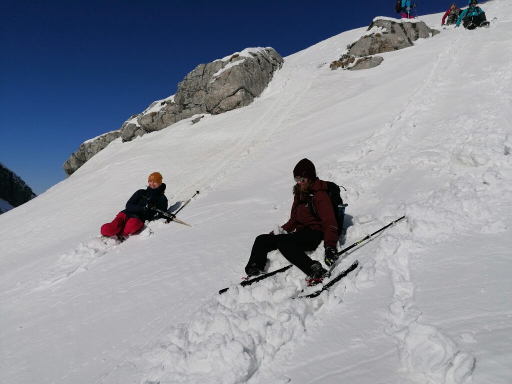 Na ja. Der Neuschnee der letzten Nacht liegt hier auf einer hart gefrorenen Kruste, die wir nicht mal mit den Zähnen der Schneeschuhe durchbrechen können. So pflügen wir uns rutschend, keuchend und teilweise auch fluchend Schritt für Schritt vorwärts. Einige kämpfen sich bis oben durch, während andere umkehren und eine längere Pause in der Sonne geniessen. Beides schön.