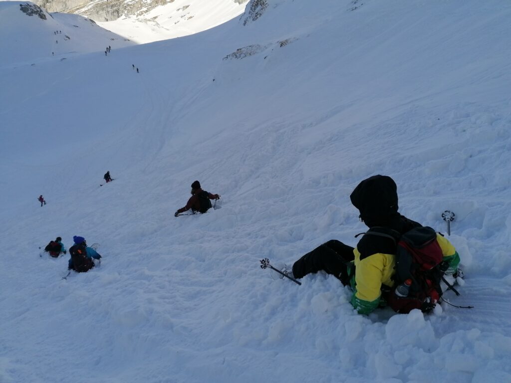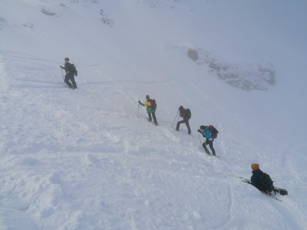Oben angekommen war nichts von den versprochenen Tiefblicken auf den Walensee zu erkennen, nur die Flumserberge scheinen von Zeit zu Zeit etwas durch. Ein kurzes Gipfelfoto und schon machen wir uns an den Abstieg. Dieser ist mindestens so abenteuerlich, aber deutlich weniger anstrengend als der Aufstieg. Meist in grossen Schritten, manchmal aber auch auf dem Hintern oder gar dem Bauch geht’s rasch hinunter, bis beim Mittagsplatz alle wieder zueinanderfinden. Hier packen wir unsere Lawinensuchgeräte, Sonden und Schaufeln aus und begeben uns auf die Suche nach einem Lawinenopfer. Gemeinsam orten wir das Signal, sondieren einen weichen Körper und schaufeln ihn erfolgreich frei. Zwar entpuppt es sich nur als Rucksack, aber im Ernstfall wäre der Ablauf derselbe.