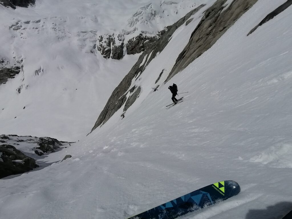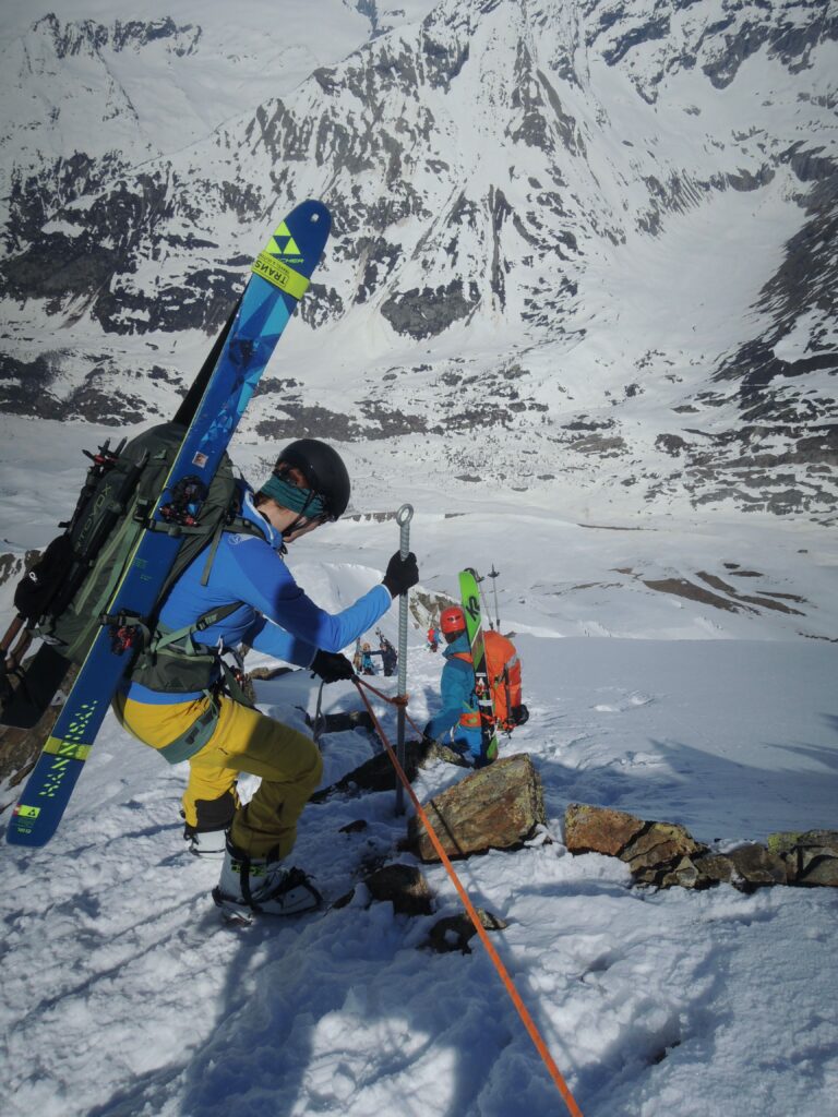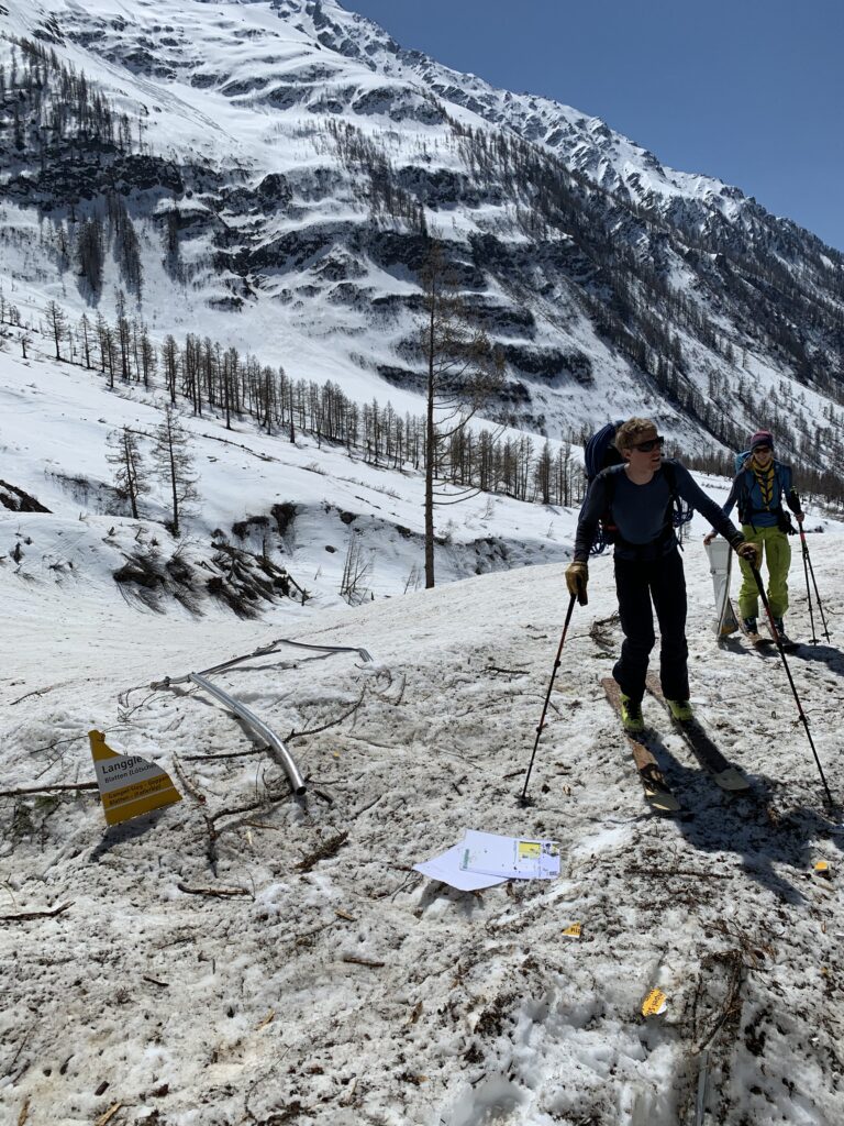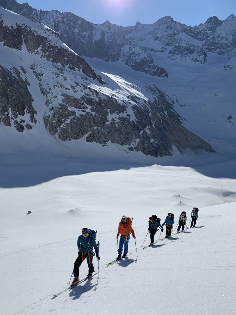 Am letzten Tag entscheiden wir uns über den Beichpass direkt ins Lötschental abzufahren. Nochmals erwartet uns hinter dem Pass eine Rinne, steiler und länger als sich viele vorgestellt hatten. Aber unterdessen schreckt uns so etwas nicht mehr ab. Schwups ein Fixseil gespannt, Prusik dran, Ski buckeln und rein in den Schlund, bis es auf der nächsten Schulter etwas flacher wird. Von hier geht’s auf den Brettern auf ungewohnt harter Unterlage der Fafleralp entgegen. Man munkelt, die mehrfachen Überschläge kurz vor Schluss seien eher als anarchistische Statements gegenüber den Leitenden als als Fahrfehler zu werten, fiel doch das Zitat des Tages keine 5 Minuten vorher. In der Fafleralp skaten wir über eindrückliche Lawinenkegel weiter bis nach Blatten (aber halt nicht das Blatten, in dem wir gestartet sind), wo seit einer Woche ja auf der Sonnenterrasse wieder Getränke und sogar Fondue angeboten werden dürfen. Ein super Abschluss einer super Kurz-Woche und einer super Wintersaison! A-T-G!