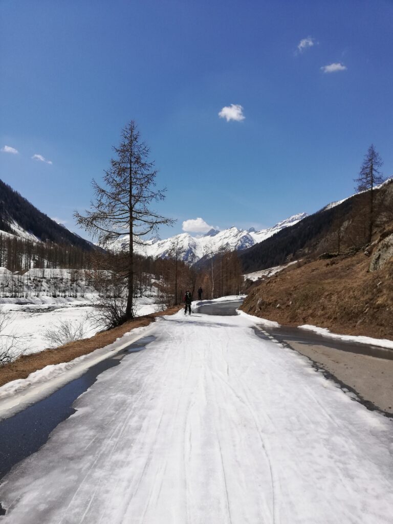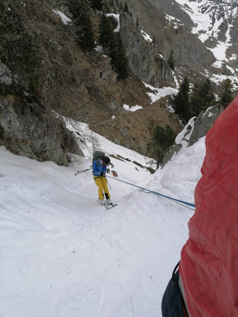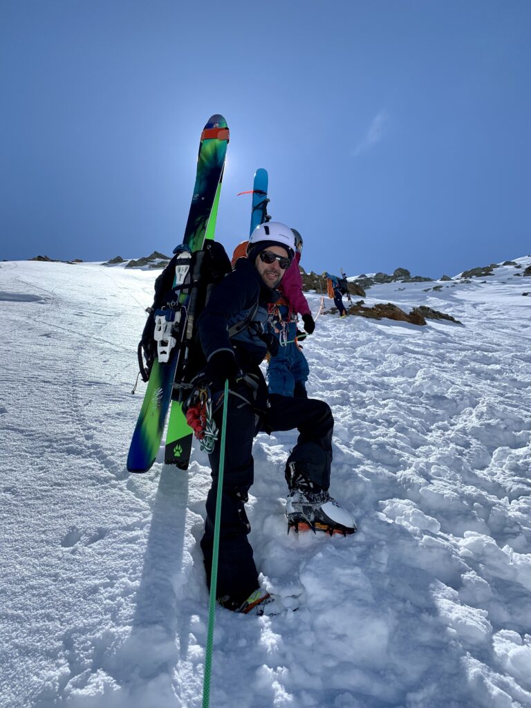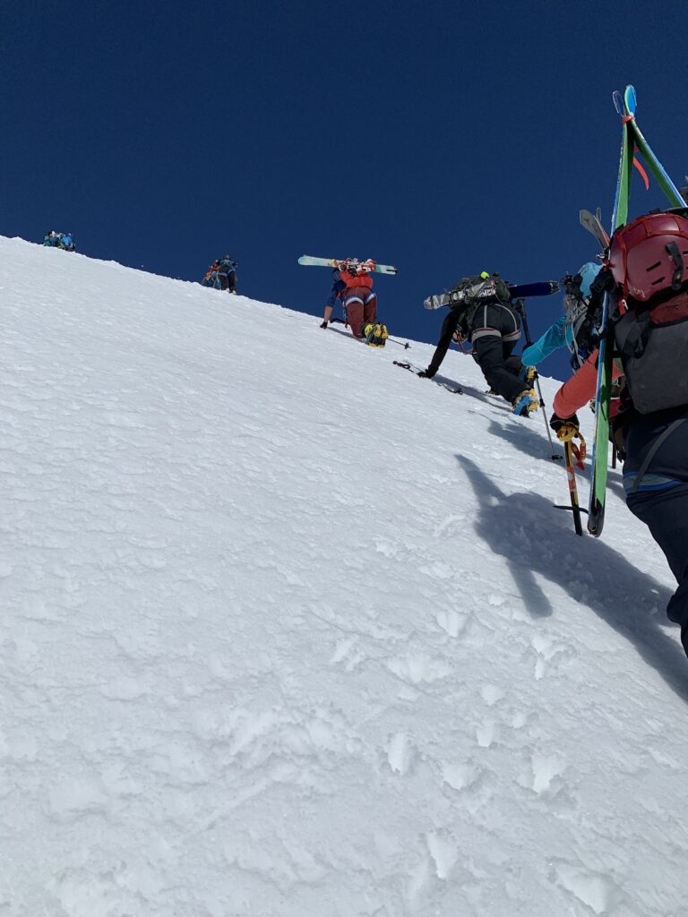 Am letzten Tag entscheiden wir uns über den Beichpass direkt ins Lötschental abzufahren. Nochmals erwartet uns hinter dem Pass eine Rinne, steiler und länger als sich viele vorgestellt hatten. Aber unterdessen schreckt uns so etwas nicht mehr ab. Schwups ein Fixseil gespannt, Prusik dran, Ski buckeln und rein in den Schlund, bis es auf der nächsten Schulter etwas flacher wird. Von hier geht’s auf den Brettern auf ungewohnt harter Unterlage der Fafleralp entgegen. Man munkelt, die mehrfachen Überschläge kurz vor Schluss seien eher als anarchistische Statements gegenüber den Leitenden als als Fahrfehler zu werten, fiel doch das Zitat des Tages keine 5 Minuten vorher. In der Fafleralp skaten wir über eindrückliche Lawinenkegel weiter bis nach Blatten (aber halt nicht das Blatten, in dem wir gestartet sind), wo seit einer Woche ja auf der Sonnenterrasse wieder Getränke und sogar Fondue angeboten werden dürfen. Ein super Abschluss einer super Kurz-Woche und einer super Wintersaison! A-T-G!