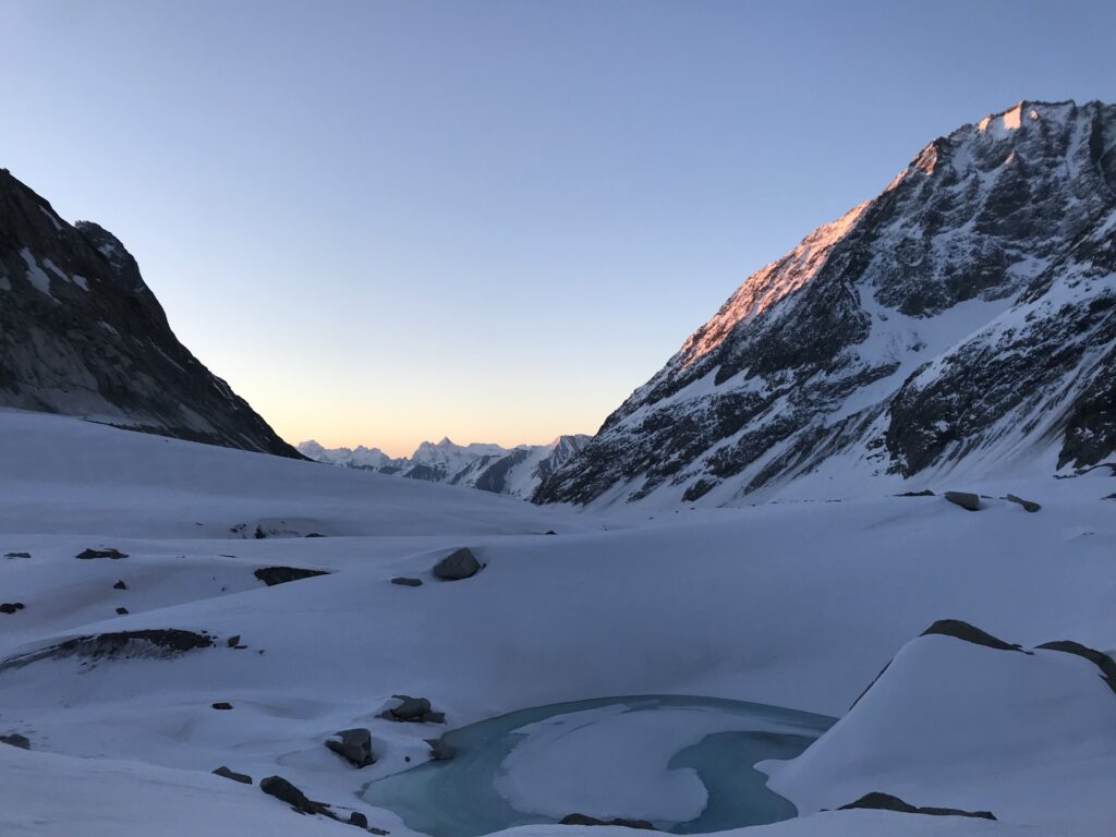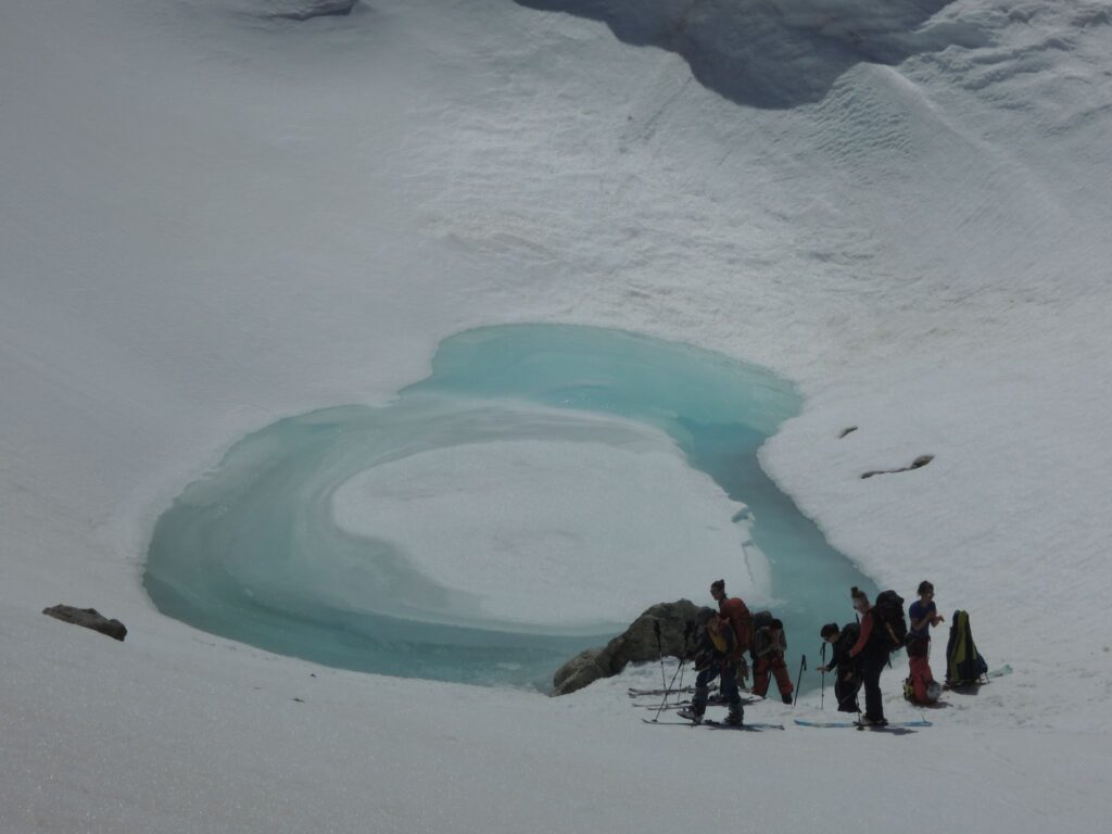 Am dritten Tag nehmen wir es etwas gemütlicher und erkunden vom P.3386 unterhalb des Schinhorns die verschiedenen Varianten für den Abschlusstag. Beim Aufstieg üben wir noch ein wenig Spitzkehren im steilen Gelände und bei der Abfahrt wird der Drang nach einer Dusche so gross, dass sich fast alle in den eiskalten Gletschersee wagen. Ob sich dies im Hinblick auf den schweisstreibenden Hüttenzustieg lohnt sei dahingestellt, cool ists auf jeden Fall!