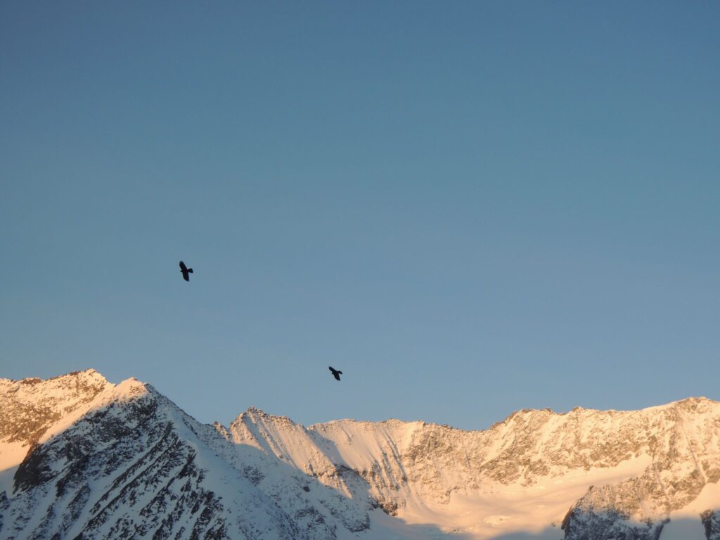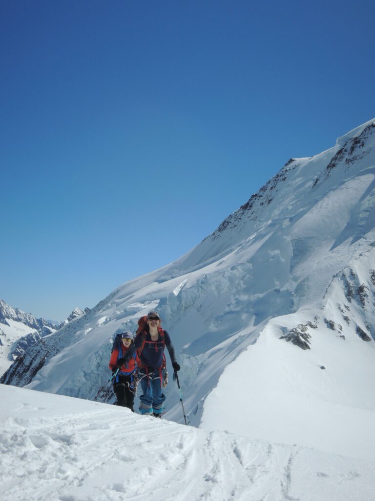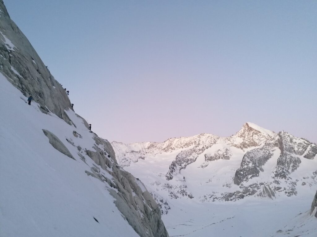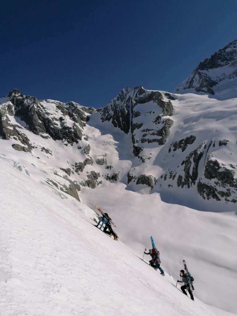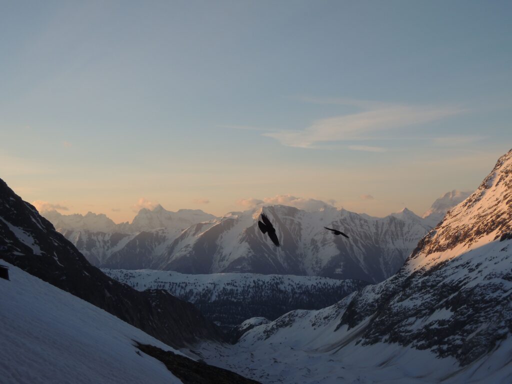Von nun an ist das Programm eingespielt: Znacht, Christians Hilferufe in Gummihandschuhen, Tourenplanung, Abend ausklingen, Schlafen, Jonas’ Wecker grummelnd zur Kenntnis nehmen, Frühstücken, Steigeisen montieren, Höhenangst ignorieren, anfellen, den kalten Morgenwind verfluchen und der Sonne entgegen-ziehen.