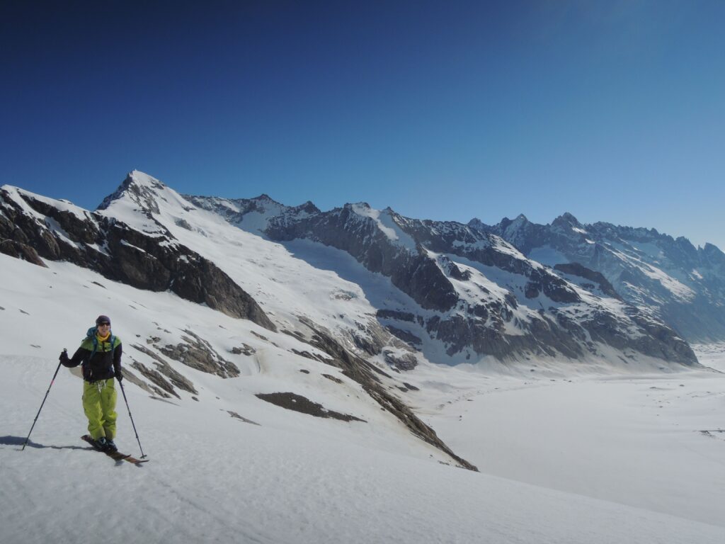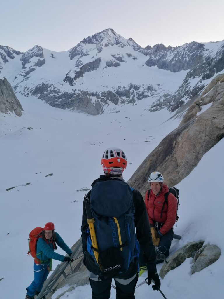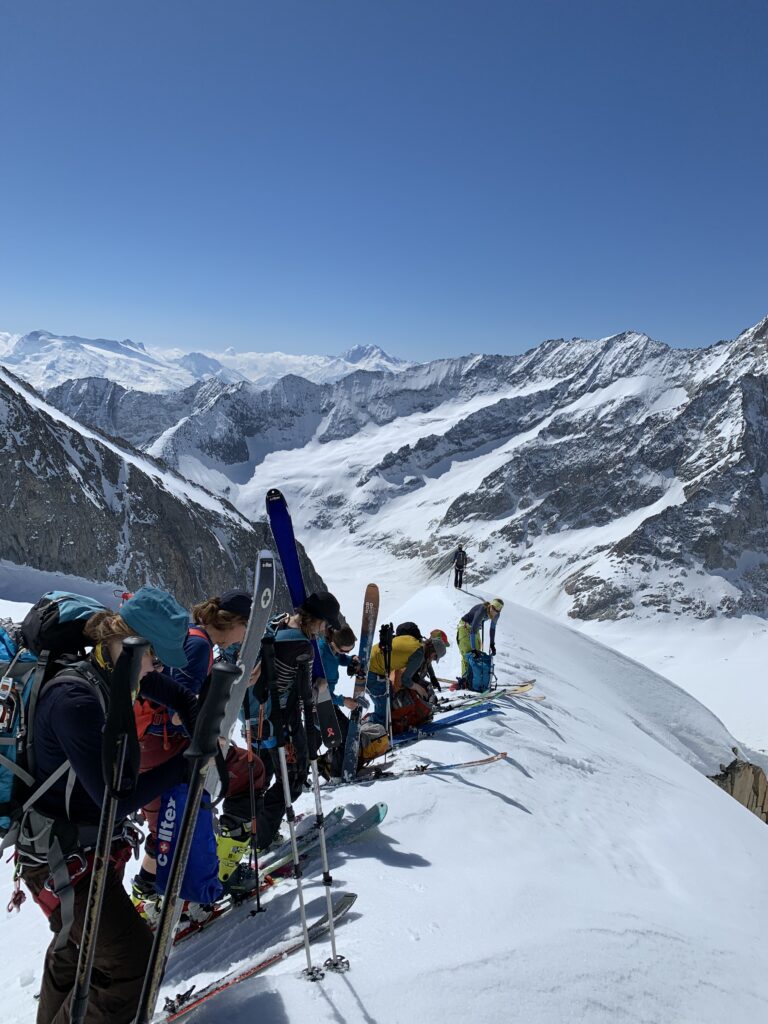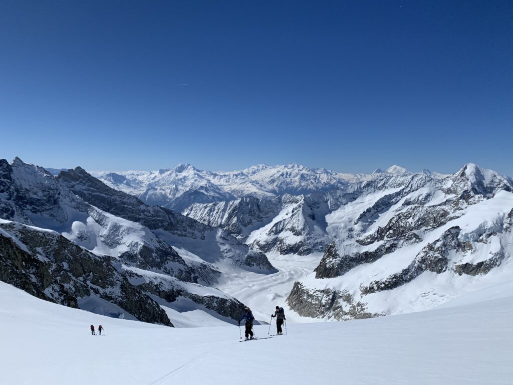 Vollbepackt mit Ski, Pickel, Steigeisen und etwas Take-Away Kaffee treffen wir uns frühmorgens auf dem Perron, begrüssen uns mit einem freundlichen Nicken und fahren gemeinsam ins Wallis. In Brig stossen auch diejenigen dazu, welche bereits eine Nacht im Westen verbracht hatten und beinahe komplett fahren wir weiter nach Blatten zur Belalp-Bahn. Nach kurzer Vorstellungsrunde in der Walliser Sonnenstube geht es gemütlich flach los. Anstatt den erhofften Sonnenstrahlen müssen wir jedoch die aufziehenden Regenwolken fürchten, welche sich im Rhonetal aufzutürmen beginnen. Glücklicherweise kommen wir gerade nochmal glimpflich davon. Am Ende dieses Einwärm-Abschnitts erwartet uns die wohl abenteuerlichste Stelle des Zustiegs: Ein doch ziemlich abschüssiges Couloir, in welches uns Jonas rückwärts und mit den Ski an den Füssen abseilt. Nach diesem Intermezzo geht es wieder steiler bergan, auf der dünnen Schneedecke Felsen, Lawinenkegel und Moränen so gut als möglich umkurvend dem Oberaletschgletscher entgegen. Auf diesem angekommen ziehen wir wieder gemütlicher weiter Richtung Hütte, wobei wir die Witterungssorgen endgültig im Tal liegen lassen können. Bald kommen aber andere Gedanken auf, denn je näher die Hütte auf ihrem Felsthron rückt, desto lauter wird auch die innere Stimme: «Wie zur Hölle soll man den diese glatt geschliffenen Felsplatten hochkommen?! Habe ich die Kletterfinken auf der Packliste übersehen?» Erst nach dem letzten Bogen um die Felsnase herum erblicken wir die Tritte, Stangen und Sicherungsseile, welche sich von der Hütte bis zum immer weiter schwindenden Gletscher hinunter winden. So lassen wir die Ski also unten im Depot und machen uns im Klettersteig-Stil an diese Himmelsleitern, zu welchen wir mit jedem Tag eine stärkere Hassliebe entwickeln werden. Hier treffen auch die Nachzügler:innen dazu, welche die SBB-bedingte Verspätung durch einen Verzicht auf Pausen wettmachen konnten. So treffen wir mehr oder weniger geschlossen auf der schönen Oberaletschhütte ein, wo uns Irene und Christian herzlich empfangen. Wir legen unsere Felle und Kleider auf der Terrasse zum Trocknen aus und freuen uns auf den wohlverdienten Znacht und das eine oder andere Erfrischungsgetränk. Nach dem Znacht planen wir die morgige Tour, spielen Tichu, behandeln die ersten Blasen und gehen im Hinblick auf das frühe Morgenessen entsprechend bald ins Bett.