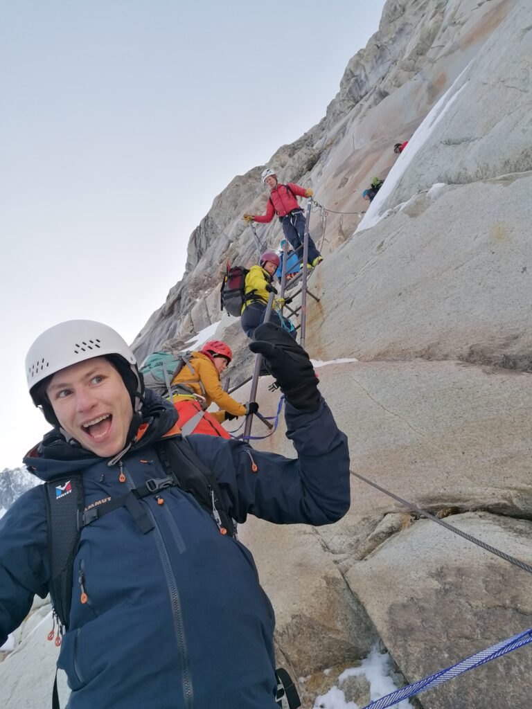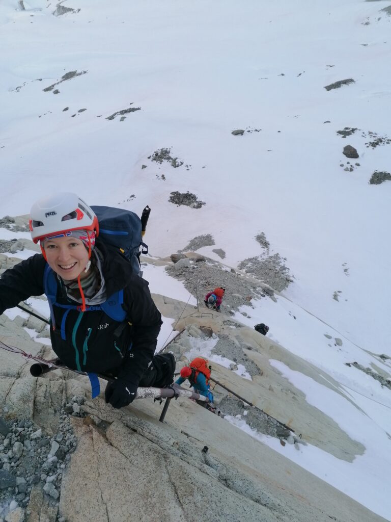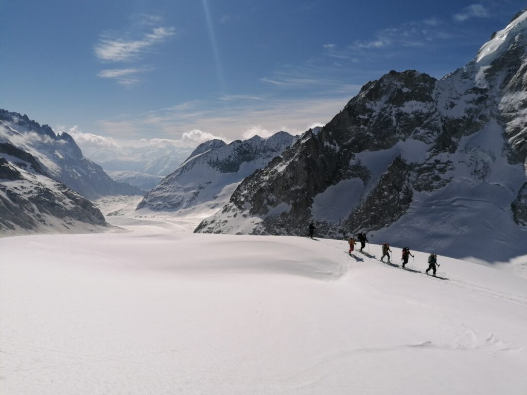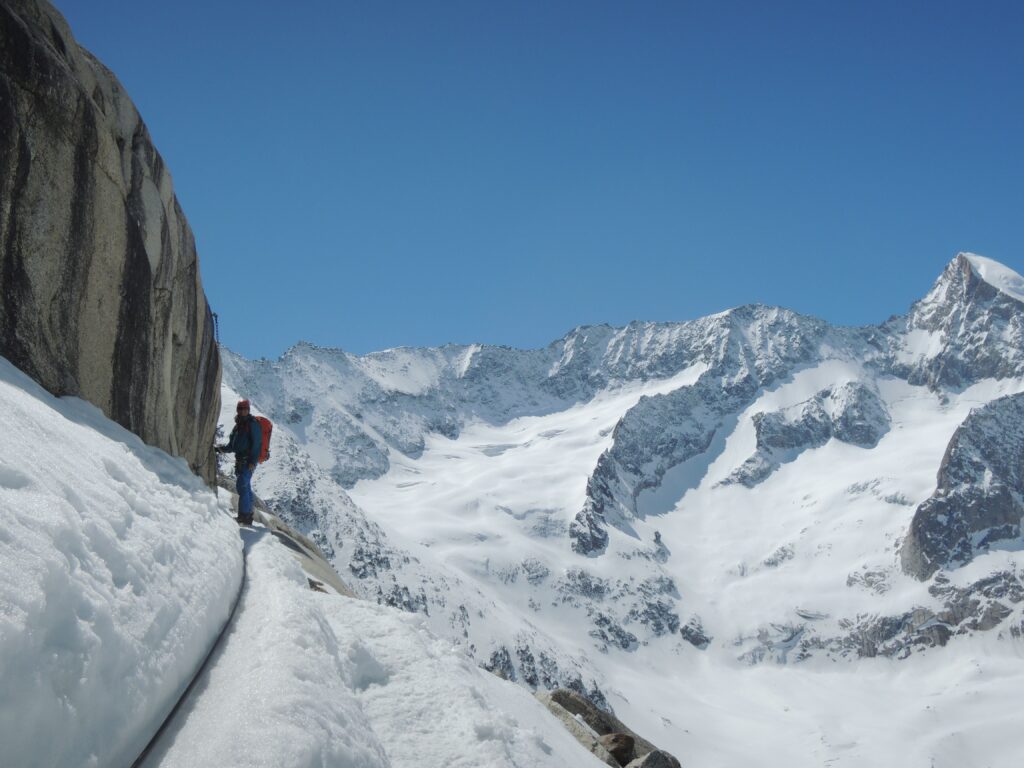 Vollbepackt mit Ski, Pickel, Steigeisen und etwas Take-Away Kaffee treffen wir uns frühmorgens auf dem Perron, begrüssen uns mit einem freundlichen Nicken und fahren gemeinsam ins Wallis. In Brig stossen auch diejenigen dazu, welche bereits eine Nacht im Westen verbracht hatten und beinahe komplett fahren wir weiter nach Blatten zur Belalp-Bahn. Nach kurzer Vorstellungsrunde in der Walliser Sonnenstube geht es gemütlich flach los. Anstatt den erhofften Sonnenstrahlen müssen wir jedoch die aufziehenden Regenwolken fürchten, welche sich im Rhonetal aufzutürmen beginnen. Glücklicherweise kommen wir gerade nochmal glimpflich davon. Am Ende dieses Einwärm-Abschnitts erwartet uns die wohl abenteuerlichste Stelle des Zustiegs: Ein doch ziemlich abschüssiges Couloir, in welches uns Jonas rückwärts und mit den Ski an den Füssen abseilt. Nach diesem Intermezzo geht es wieder steiler bergan, auf der dünnen Schneedecke Felsen, Lawinenkegel und Moränen so gut als möglich umkurvend dem Oberaletschgletscher entgegen. Auf diesem angekommen ziehen wir wieder gemütlicher weiter Richtung Hütte, wobei wir die Witterungssorgen endgültig im Tal liegen lassen können. Bald kommen aber andere Gedanken auf, denn je näher die Hütte auf ihrem Felsthron rückt, desto lauter wird auch die innere Stimme: «Wie zur Hölle soll man den diese glatt geschliffenen Felsplatten hochkommen?! Habe ich die Kletterfinken auf der Packliste übersehen?» Erst nach dem letzten Bogen um die Felsnase herum erblicken wir die Tritte, Stangen und Sicherungsseile, welche sich von der Hütte bis zum immer weiter schwindenden Gletscher hinunter winden. So lassen wir die Ski also unten im Depot und machen uns im Klettersteig-Stil an diese Himmelsleitern, zu welchen wir mit jedem Tag eine stärkere Hassliebe entwickeln werden. Hier treffen auch die Nachzügler:innen dazu, welche die SBB-bedingte Verspätung durch einen Verzicht auf Pausen wettmachen konnten. So treffen wir mehr oder weniger geschlossen auf der schönen Oberaletschhütte ein, wo uns Irene und Christian herzlich empfangen. Wir legen unsere Felle und Kleider auf der Terrasse zum Trocknen aus und freuen uns auf den wohlverdienten Znacht und das eine oder andere Erfrischungsgetränk. Nach dem Znacht planen wir die morgige Tour, spielen Tichu, behandeln die ersten Blasen und gehen im Hinblick auf das frühe Morgenessen entsprechend bald ins Bett.