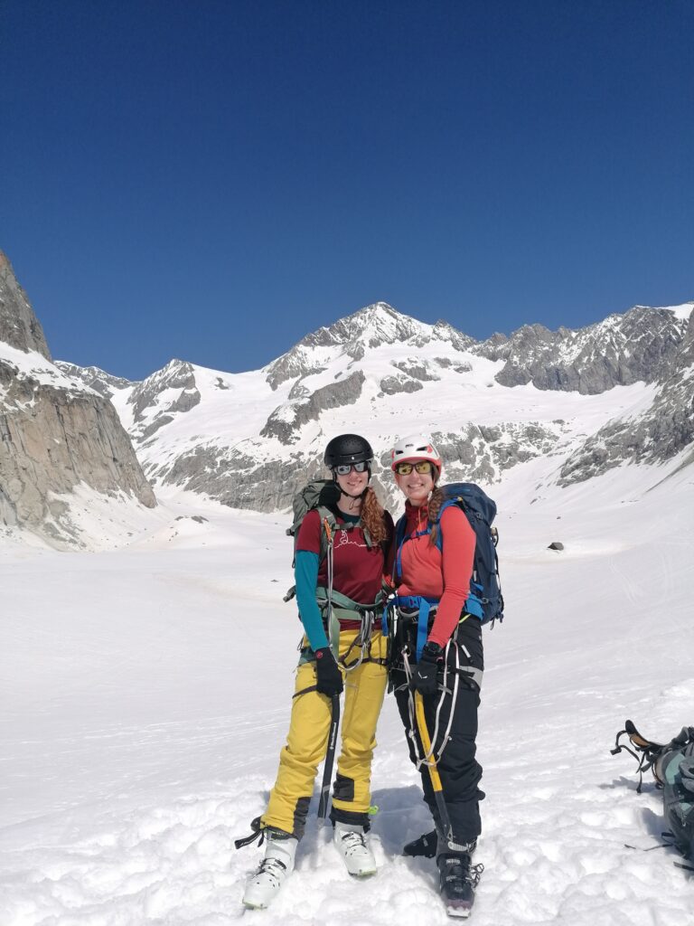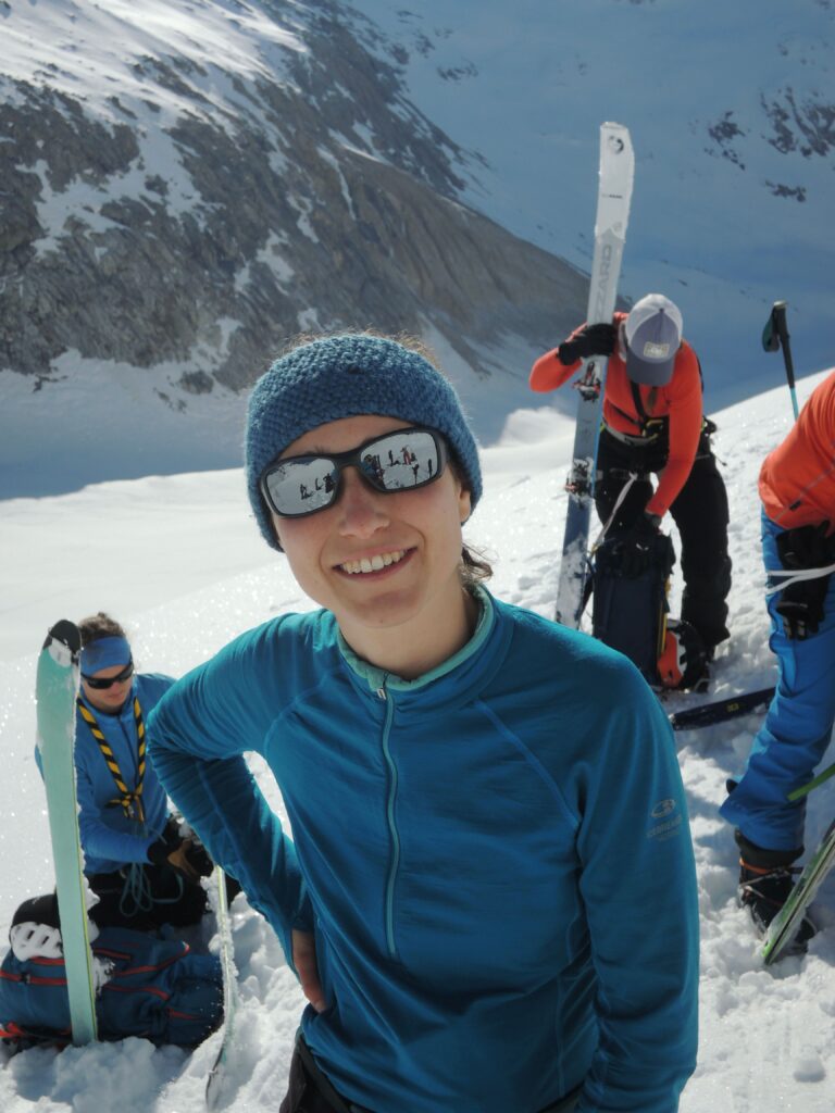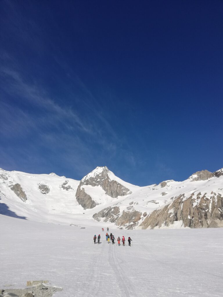 Wie so oft auf Hütten gestaltet sich die Nacht je nach Vorhandensein von guten Ohropax mehr oder weniger erholsam, am nächsten Morgen sitzen jedoch alle am Frühstückstisch und nippen gähnend am Kaffee. Dieser zeigt Wirkung und so stehen kurz daraufhin die meisten draussen in der Dämmerung und fragen sich, wie sie den Klettersteig mit Steigeisen an den Füssen wohl meistern werden. Schweren Herzens verabschieden wir uns von den zwei, welche aus gesundheitlichen Gründen zu Hause bleiben und sind insgeheim etwas neidisch auf die idyllische Bettruhe, welche sie nun geniessen dürfen. Wir ziehen also los, meistern die Eisentritte und Leitern mit Bravour und touren dem kalten Gletscherwind entgegen bis uns genau vor der ersten Steilstufe die Sonne begrüsst. Hier zeigt uns Jonas, wie man sich mit Steigeisen auch in steilerem Gelände effizient und sicher bewegt. Wieder auf den Fellen spüren wir, dass sich die letzte Rampe auf 3000m über Meer und in der prallen Sonne alles andere als gratis erklimmen lässt. Langsam, aber stetig keuchen wir der Sattellicka entgegen, welche wir kurz vor Mittag erreichen. Die Off-Pisten-Rowdys unter uns haben den Sulz nun gerochen und so geht es bereits nach einer kurzen Snackpause und den letzten Schlucken Tee (den nehme ich morgen sicher nicht mehr kochend heiss mit) bereits hangabwärts. Mit brennenden Oberschenkeln, wedelnden Schwüngen und der einen oder anderen akrobatischen (wenn auch ungewollten) Skiballett-Einlage nähern wir uns rasch dem Talboden. Dieser ist bereits so aufgeweicht, dass sich die nächste halbe Stunde mehr nach einer surfen als Skifahren anfühlt. Beim Depot angekommen hangeln wir uns gruppenweise den nun bekannten Seilen wieder empor und werden von den Daheimgebliebenen fröhlich empfangen. Die einen verschwinden für einen kurzen Nap im leeren Schlafsaal, während sich die anderen der Speise- und Getränkekarte zuwenden.