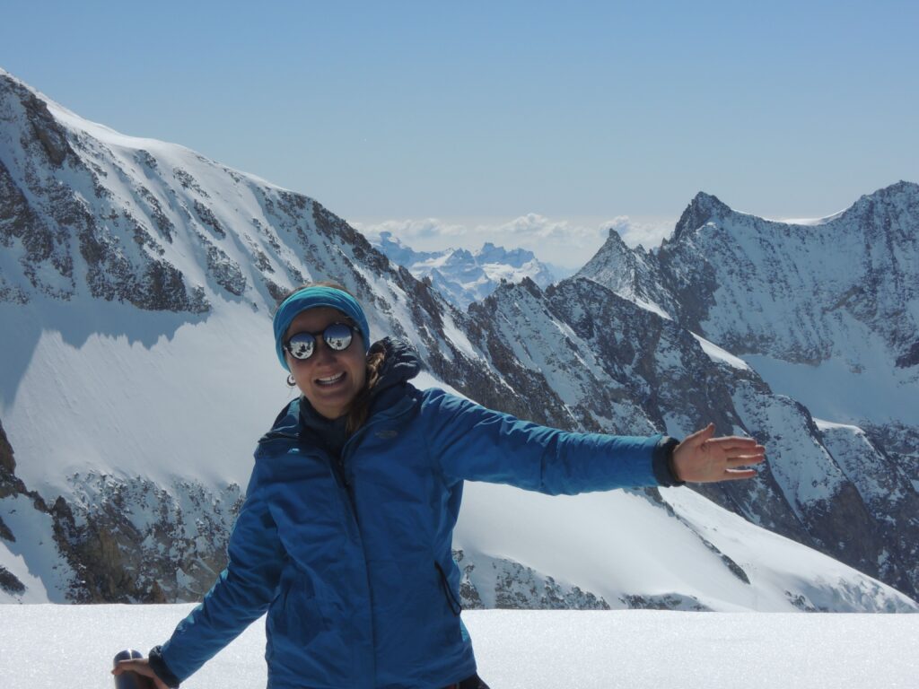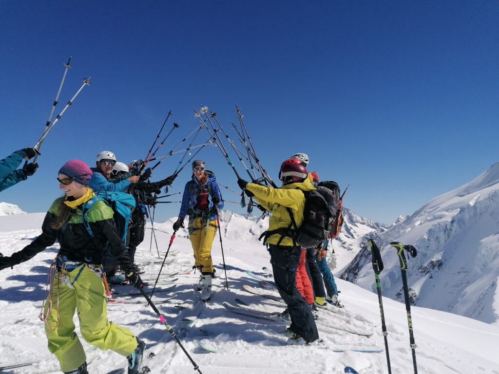Am zweiten Tag haben wir den Höhepunkt der Woche auf dem Programm: Das kleine Aletschhorn, 3745m.ü.M. Entsprechend ist heute alles noch etwas früher und die Pausen noch etwas speditiver (aka kürzer). Die Teilnehmenden sind jedoch alle richtig fit und so erreichen wir um 11 Uhr alle zusammen den wohl höchsten Wintergipfel der Mountainscoutsgeschichte. Nach La Ola für die letzten heroischen Gipfelstürmerinnen, Mittagspause, Panoramasession mit Jonas und Territorium-Markierungen zur allgemeinen Belustigung freuen wir uns auf die rassige Abfahrt. Diese wartet nebst offenen Sulzhängen auch noch mit einer felsigen Stufe auf, welche wir erneut durch ein steiles Couloir überwinden, diesmal jedoch ohne Seil. Nun geht’s in bekannter Manier zurück zum Depot und von da zu Rösti, Chässchnitte und Marketingdiskussionen. Zudem erwartet uns Irene mit Hundeblick und zeigt auf die 6 grossen Helikörbe voll Holz, welches rechtzeitig an den «Schärmen» gebracht werden musst. Janu, bei den nächtlichen Holzfällern unter uns sollte dies kein Problem darstellen.