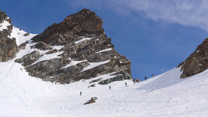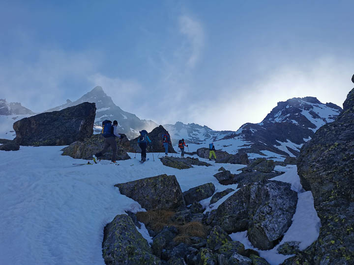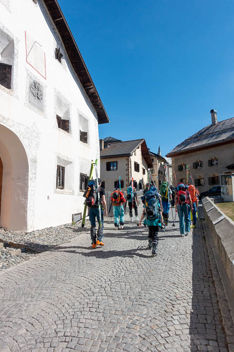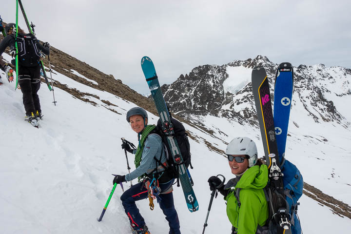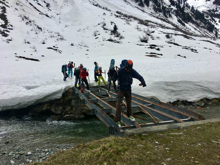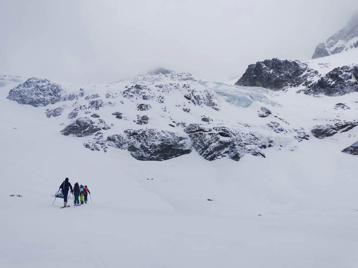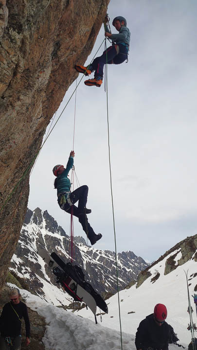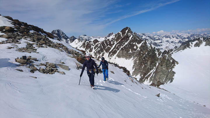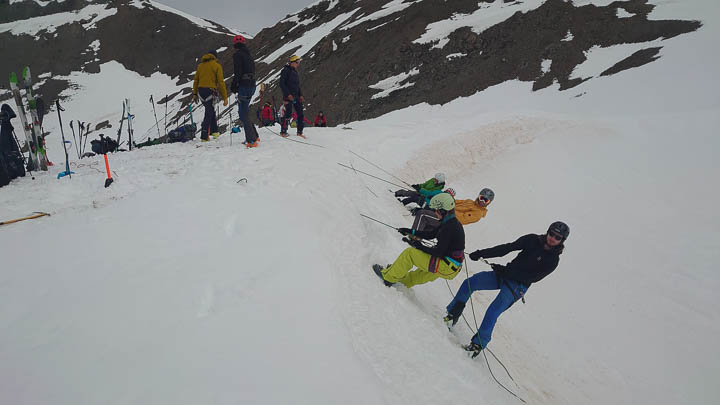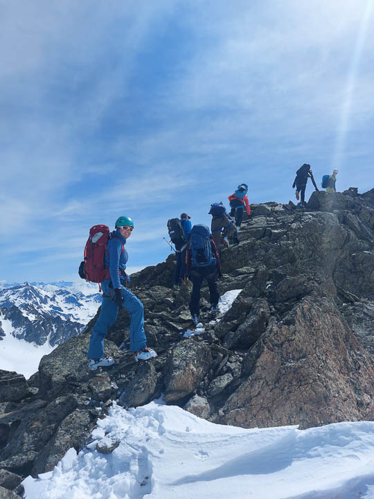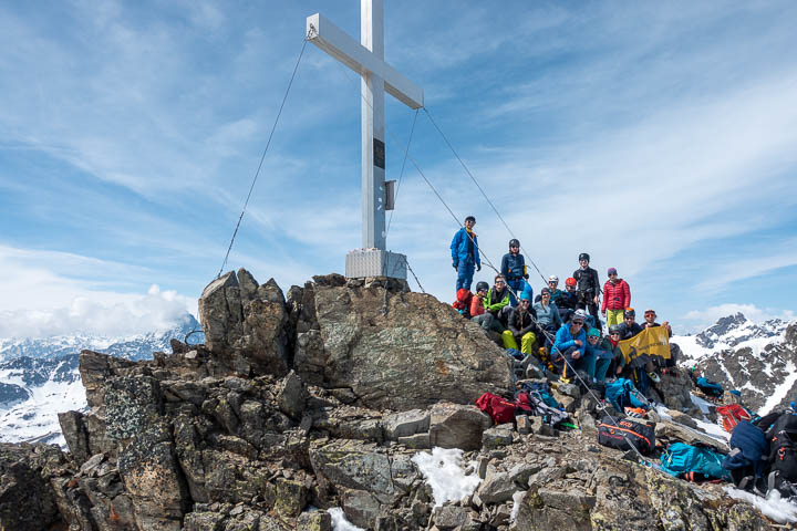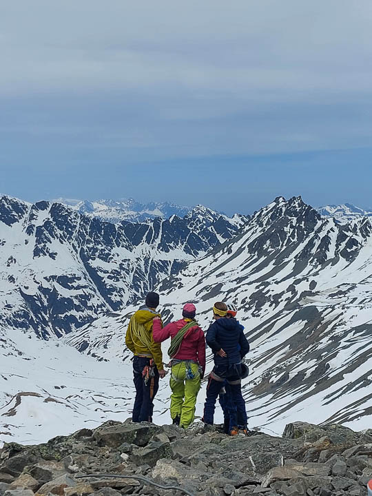 Zusammenfassend kann man von einer sehr abwechslungsreichen Tourenwoche sprechen. Wir hatten einen sommerlichwarmen Hüttenzustieg grösstenteils zu Fuss und im Tshirt und Gipfelbesteigungen mit Expeditionsfeeling durch eisige Winde. Kleine urchige Hütten und Hütten mit integrierter Kletterhalle. Genussreiche Abfahrten im Sulz und Schwünge im frischen Pulverschnee. Weite Aussichten bis zum Piz Bernina und eindrucksvolle Ausflüge in Gletscherhöhlen. Ausbildung vom Selbstaufstieg aus der Gletscherspalte bis zum Gehen auf Steigeisen und der Pickelbremse. Auch von hart umkämpften Tichumätschs bis zum simplen Leiterlispiel war alles vorhanden. Was alle Tage gemeinsam hatten war der nachmittägliche Kaffee und Kuchen in der Hütte sowie zufriedene Teilnehmende.