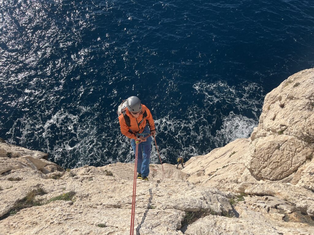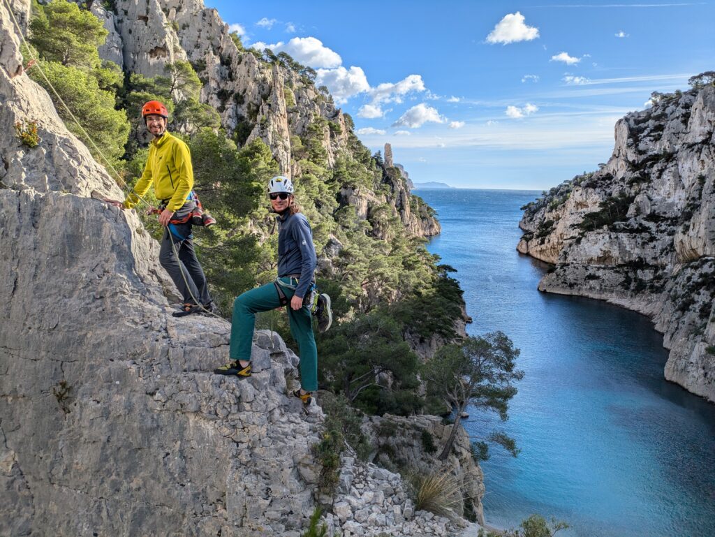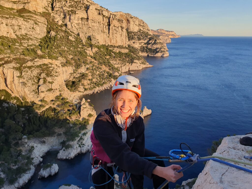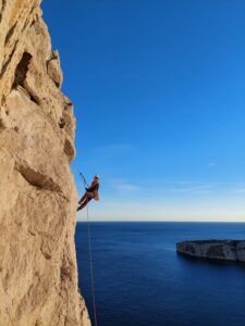 …jeweils fast die einzigen am Fels, was sicher auch mit den teils abenteuerlichen Zufahrtswegen durch enge Gassen und auf kurvigen Waldwegen zu tun hatte. Die grösste Herausforderung neben den Schlüsselstellen bestand darin, sich beim Klettern und Sichern nicht von der atemberaubenden Aussicht ablenken zu lassen. Das musste auch ein Handy am eigenen Leib erfahren, als es nicht nur einmal, sondern gar zweimal abstürzte (und beim zweiten Mal auch definitiv den Geist aufgab). Auch kulinarisch hatte die Kletterei einiges zu bieten: Rosmarin à discrétion und etwas Salz, wenn man den ins Meer gefallene Teil des Seils zum Klippen in den Mund nahm (oder gar den Fels ableckte). An der wärmenden Sonne war es manchmal T-Shirt-Wetter und auf jeden Fall warm genug für kurze Abstecher ins Meer. Abends kletterten wir jeweils solange wir konnten und kehrten oft erst im Dunkeln zu unserem eher rustikalen und fast ausgestorbenen Camping zurück. Diesem hauchten wir neues Leben ein: zusammen kochten wir Risotto, Paella und andere leckere Abendessen, sangen Lieder mit Gitarrenbegleitung, durchquerten ein Spinnennetz unter fachkundiger Anleitung von Mona und raschelten auf unseren Luftmatten mit dem kühlen Wind um die Wette. Die Abende waren doch sehr frisch und wir waren froh um unsere flauschigen Daunenjacken und dicken Schlafsäcke. Morgens erleichterte uns das frisch duftende Brot von der nahen Boulangerie und die Aussicht auf einen weiteren sonnigen Klettertag das Aufstehen. Nach einer fantastischen Woche ging es dann wieder zurück: Weg vom weissen Fels, zurück in die mittlerweile schneeweisse Heimat.