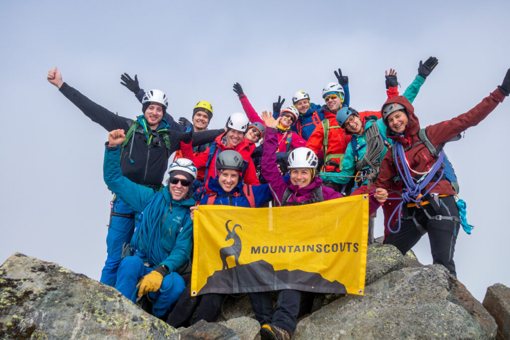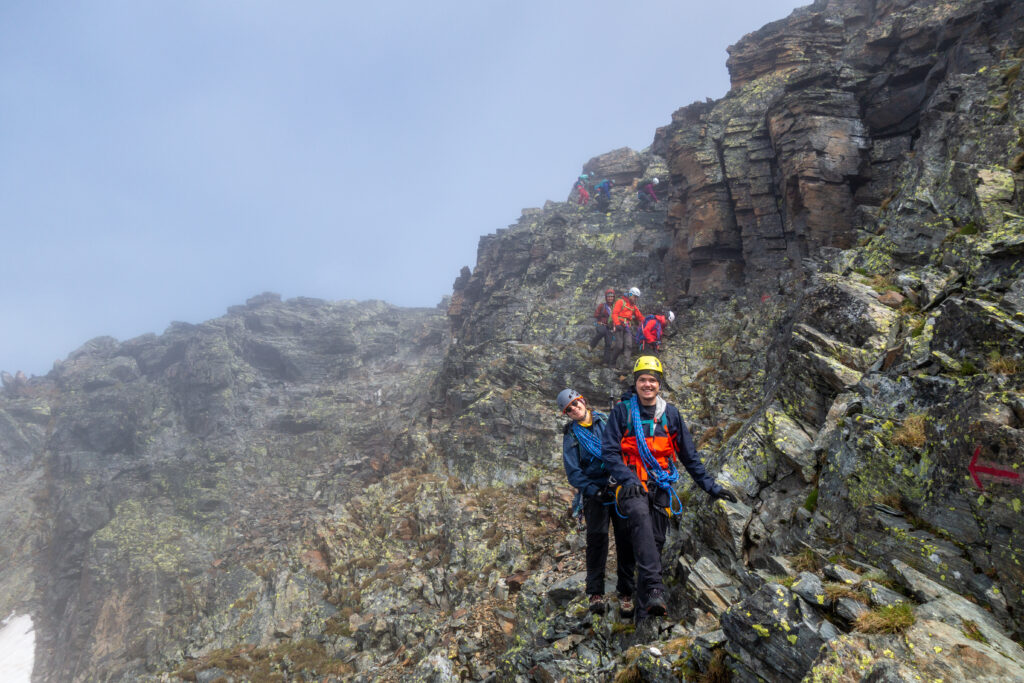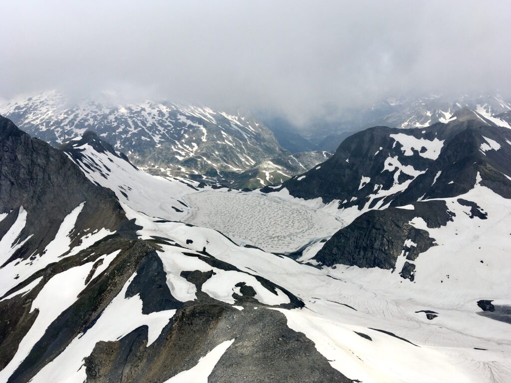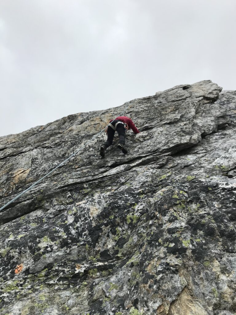 Unser gestecktes Ziel für den zweiten Tag: der Piz Terri. Beschrieben als «prachtvolle, scharfkantige Gipfelpyramide» ist er mit 3149m.ü.M. der höchste Berg der Gegend. Die Erwartungen an die Aussicht dementsprechend gross. Wir staunten über den widerstandskräftigen Marienkäfer kurz unterhalb des Gipfels, die imposante Hängebrücke, genossen ein Eisbad beim Abstieg und den Greinakuchen in der Terrihütte. Die Aussicht vom Gipfel wurde uns aber leider mehrheitlich verwehrt. Am dritten Tag wanderten wir entlang des mäandrierenden Rheins durch die Greinaebene um den Piz Valdraus zu übersteigen. Auch da präsentierte sich durchgängiges, meditatives Weiss. Dieses zeigte sich optimal zum Skifahren auf Schuhsohlen. Die Pickelbremse zeigte sich nützlich. Der frischgebackene Kuchen in der Medelserhütte überbot unsere Erwartungen und die speziellen Verhältnisse wurden vom historischen Fussballspiel der Schweizer Nati nochmals unterstrichen. Am vierten Tag kletterten wir durch Nebel, Wind und Hagel an der «Morgensonne» hoch (Name der Kletterroute ausnahmsweise nicht Programm) und so waren wir gewappnet für den krönenden Abschluss am Piz Caschleglia vom fünften Tag. Dieser zeigte sich erneut facettenreich und die rutschigen Felsen forderten unsere Hände und Trittsicherheit.